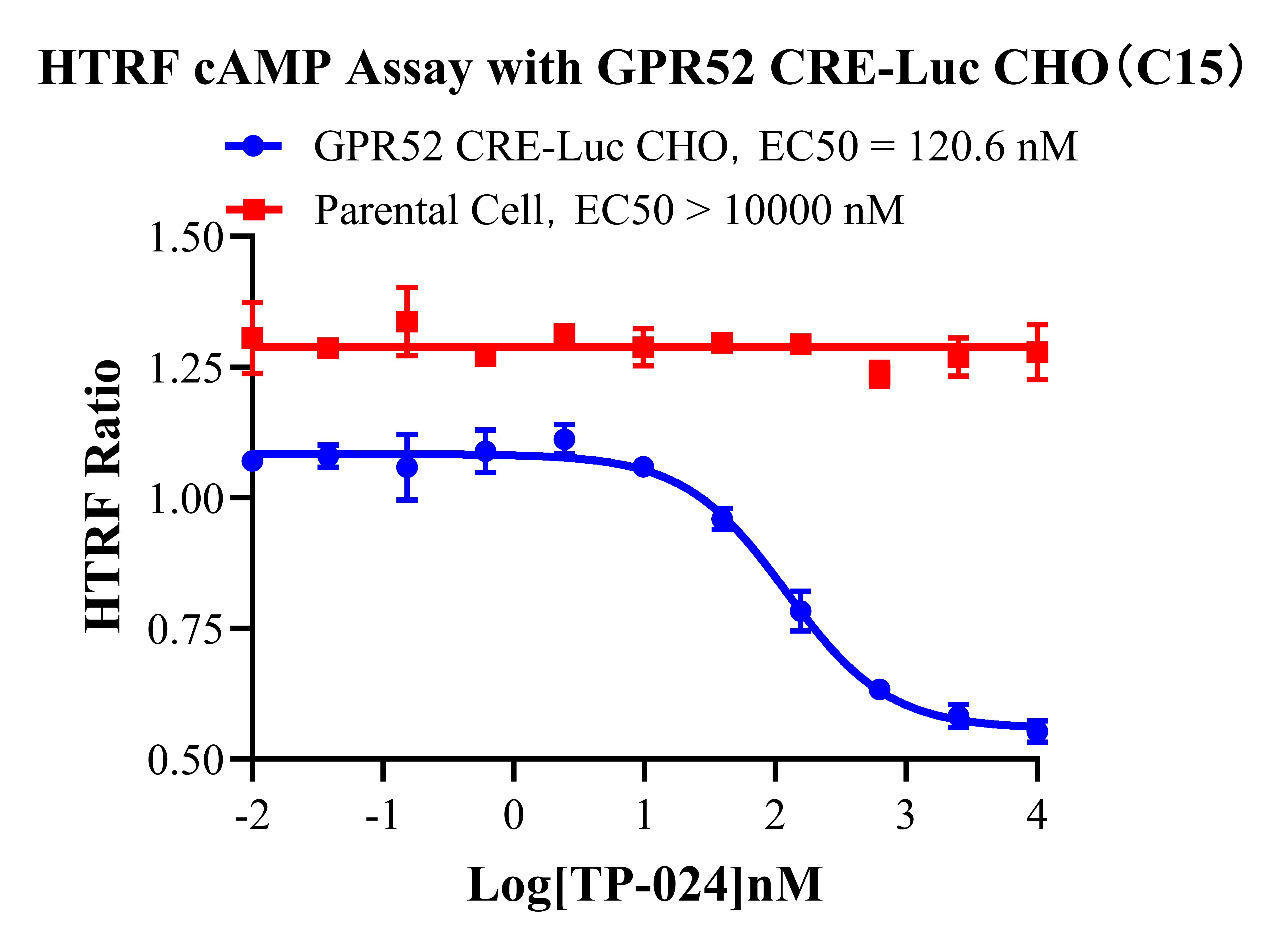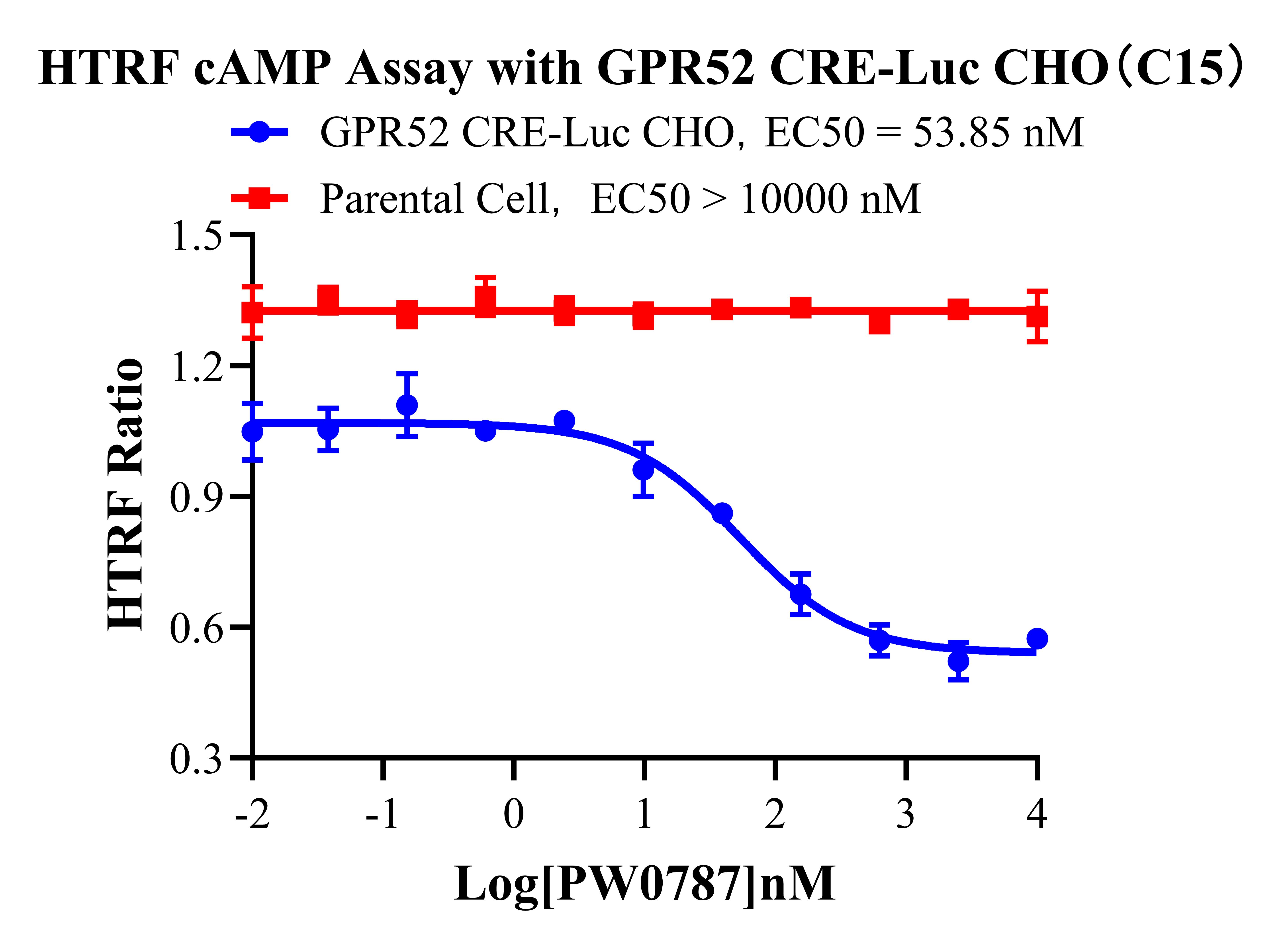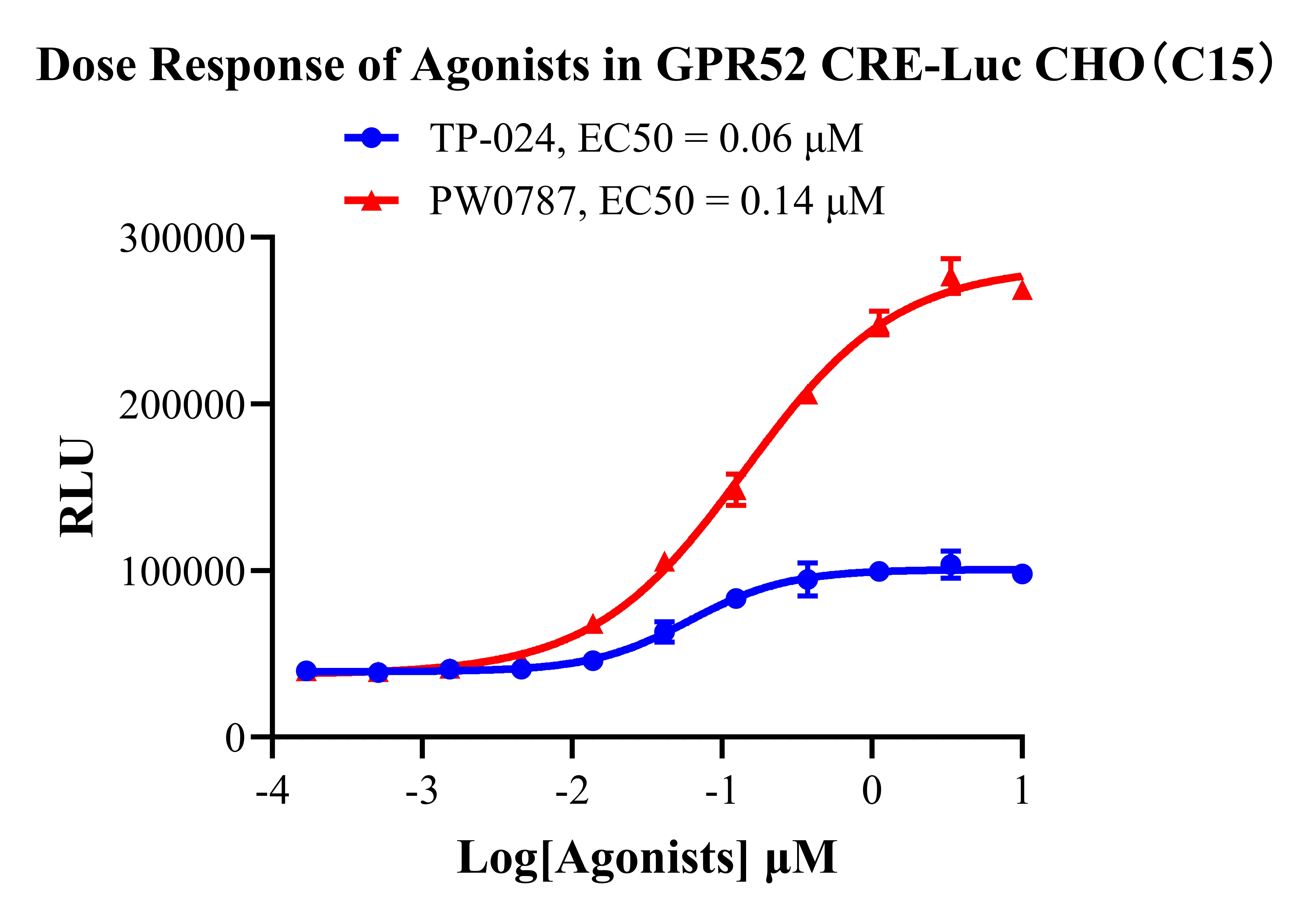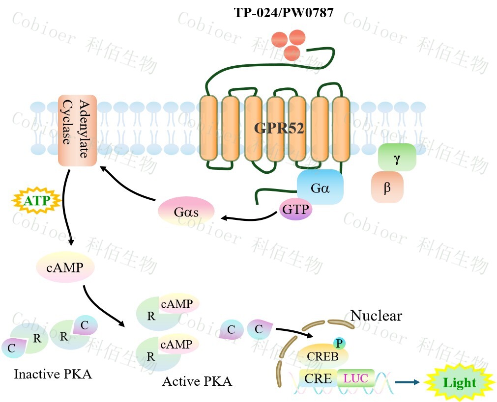 GPR52 CRE-Luc CHO 報告基因藥靶模型很好的模擬了體內 GPR52 的信號轉導過程, 原理見下圖所示。![]() Figure 1. GPR52 CRE-Luc CHO 細胞模型原理圖 |
