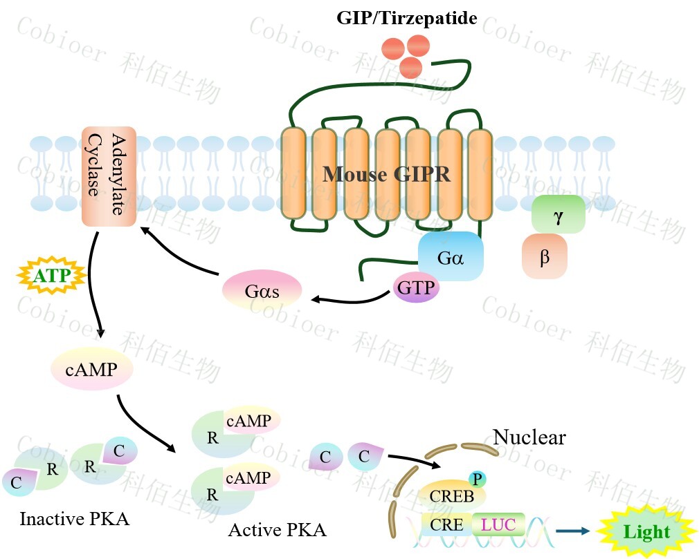 Mouse GIPR CRE-Luc HEK293 報(bào)告基因藥靶模型很好的模擬了體內(nèi) GIPR 的信號(hào)轉(zhuǎn)導(dǎo)過(guò)程,原理見(jiàn)下圖所示。