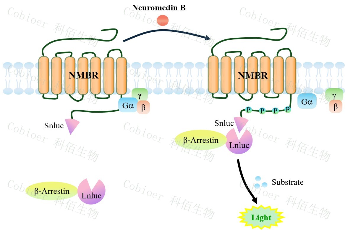 NMBR(BB1) β-Arrestin CHO 報告基因藥靶模型很好的模擬了體內 NMBR/β-Arrestin 的信號轉導過程,原理見下圖所示。當缺乏配體刺激時,β-Arrestin 不與 NMBR 結合,融合β- Arrestin 的熒光素酶處于失活構象,當 NMBR 遭遇配體刺激時,融合熒光素酶報告基因的 β-Arrestin 被招募,使熒光素酶報告基因處于激活狀態,加入其底物后發光信號增強。![]() Figure 1. NMBR(BB1) β-Arrestin CHO 細胞模型原理圖 |