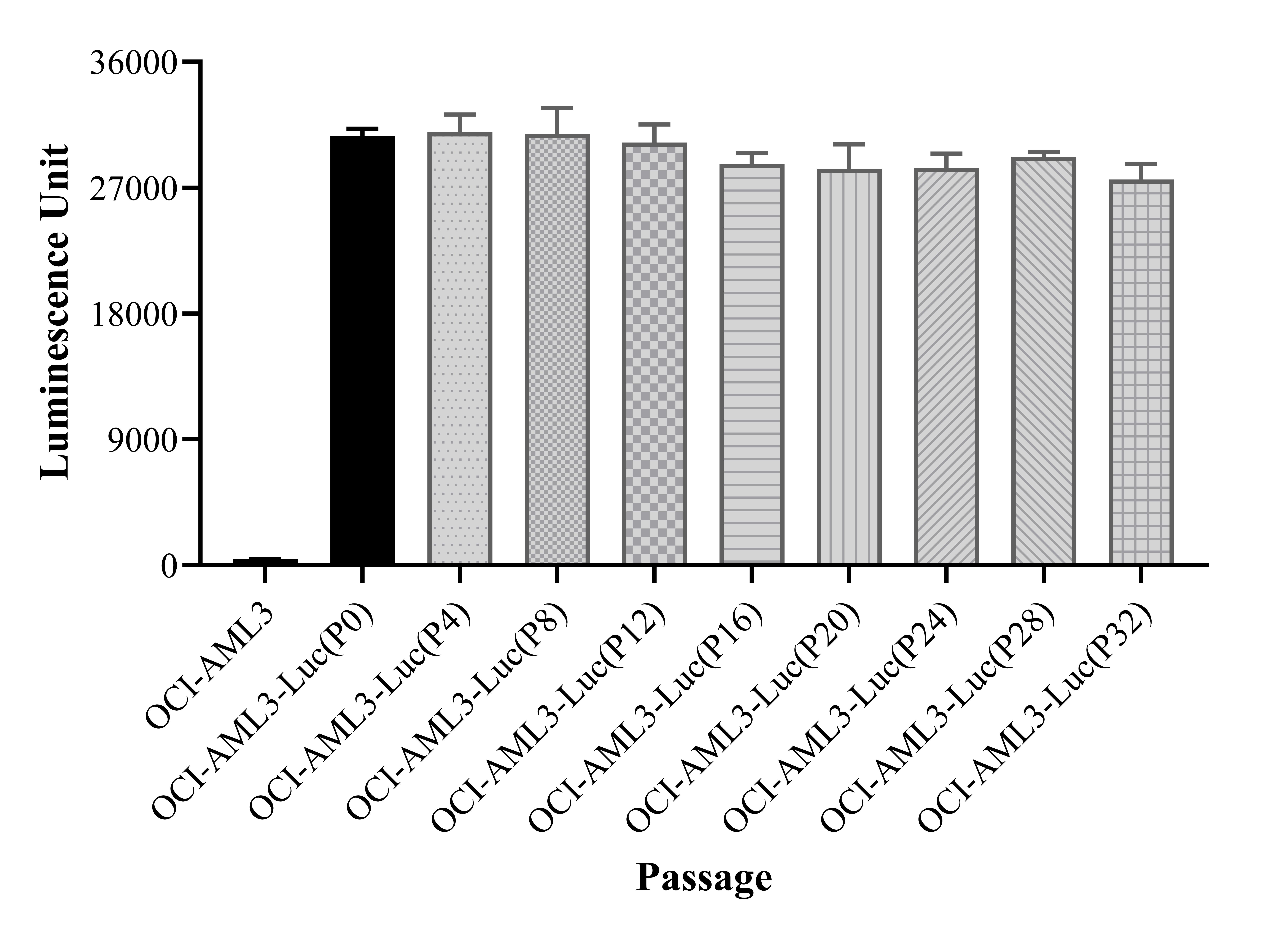 Figure 1. Stablity test results. OCI-AML3-Luc showed at least 32 passage stability with similar luminescence unit. |