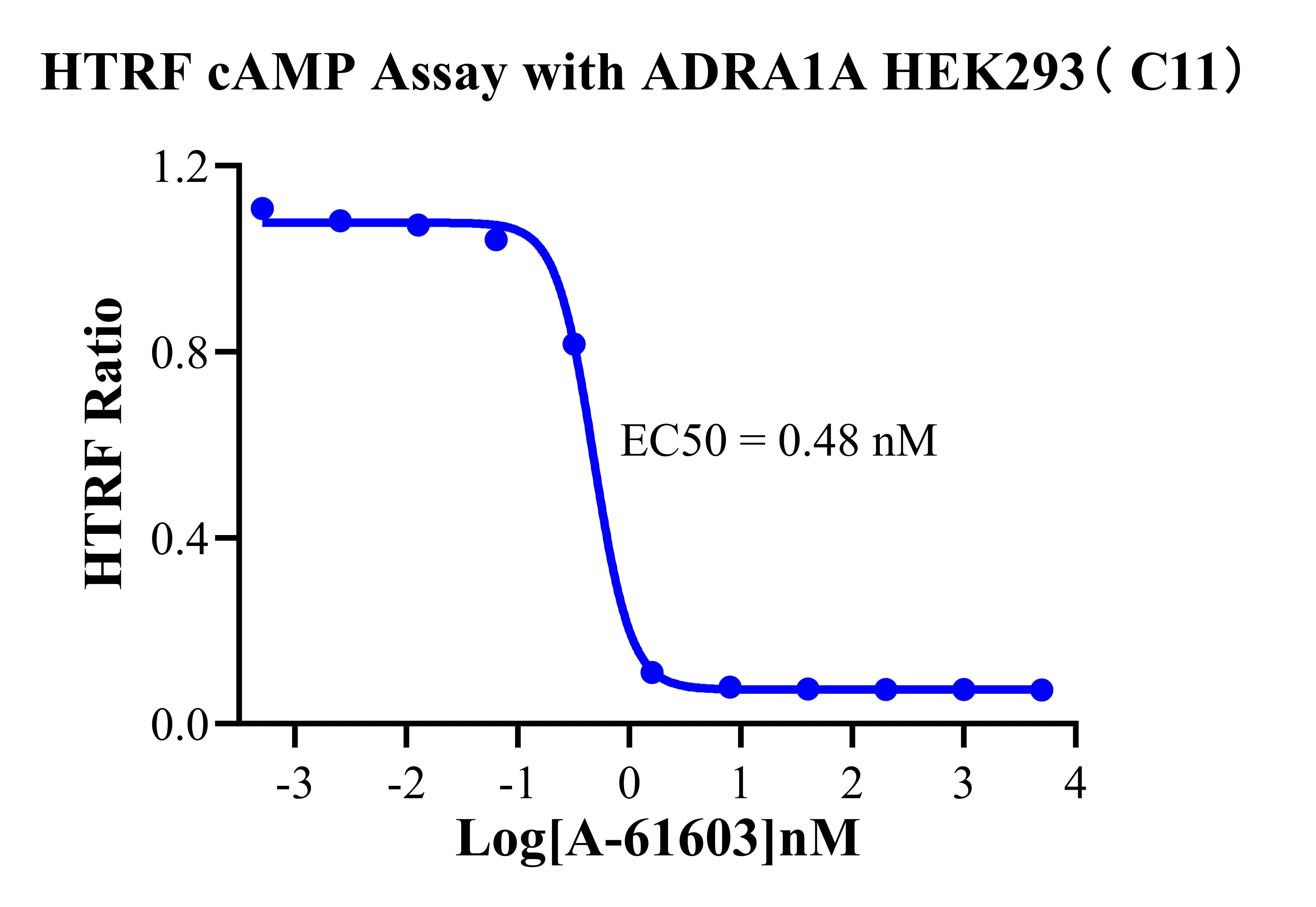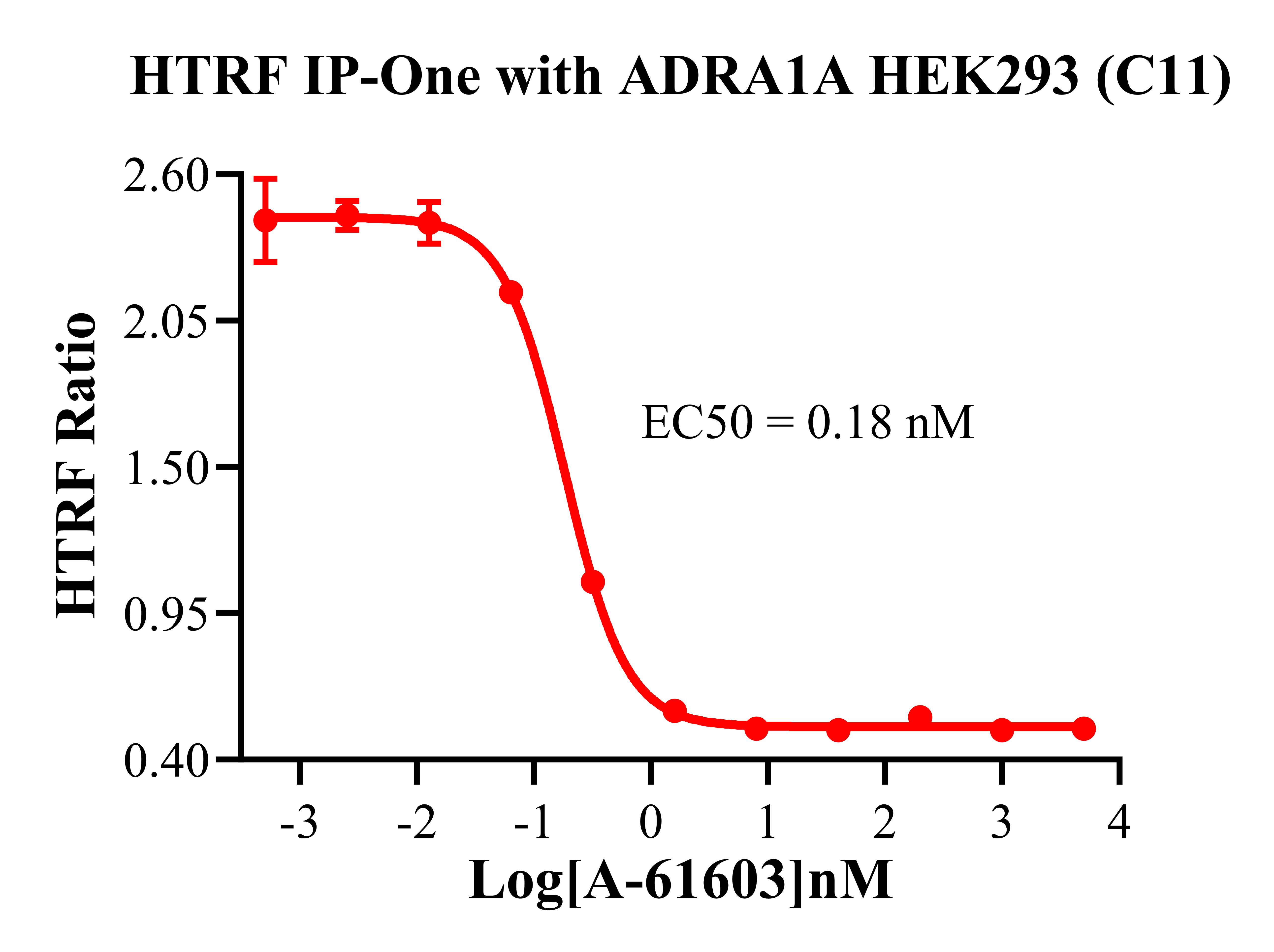 ADRA1A 還可以通過 Gq 蛋白的信號通路,調控 IP1 的升高。ADRA1A 與配體結合, 導致 Gαq 亞基的激活,觸發 PLC-γ,從而產生兩個第二信使:IP3 和 DAG,它們參與細胞 內鈣動員。由于 IP3 在代謝上不穩定,因此測量通路激活的替代標志物 IP1 作為檢測標準。