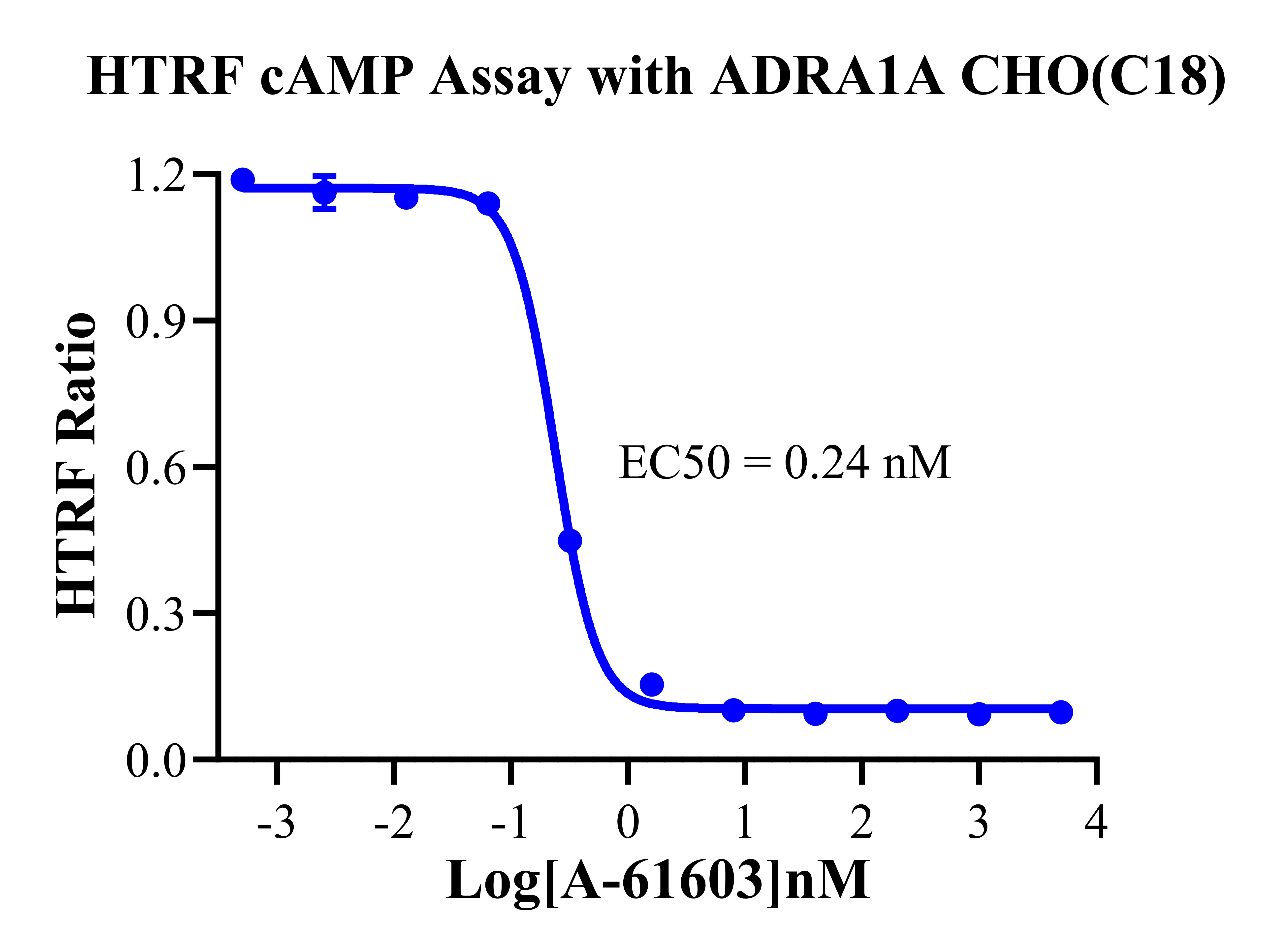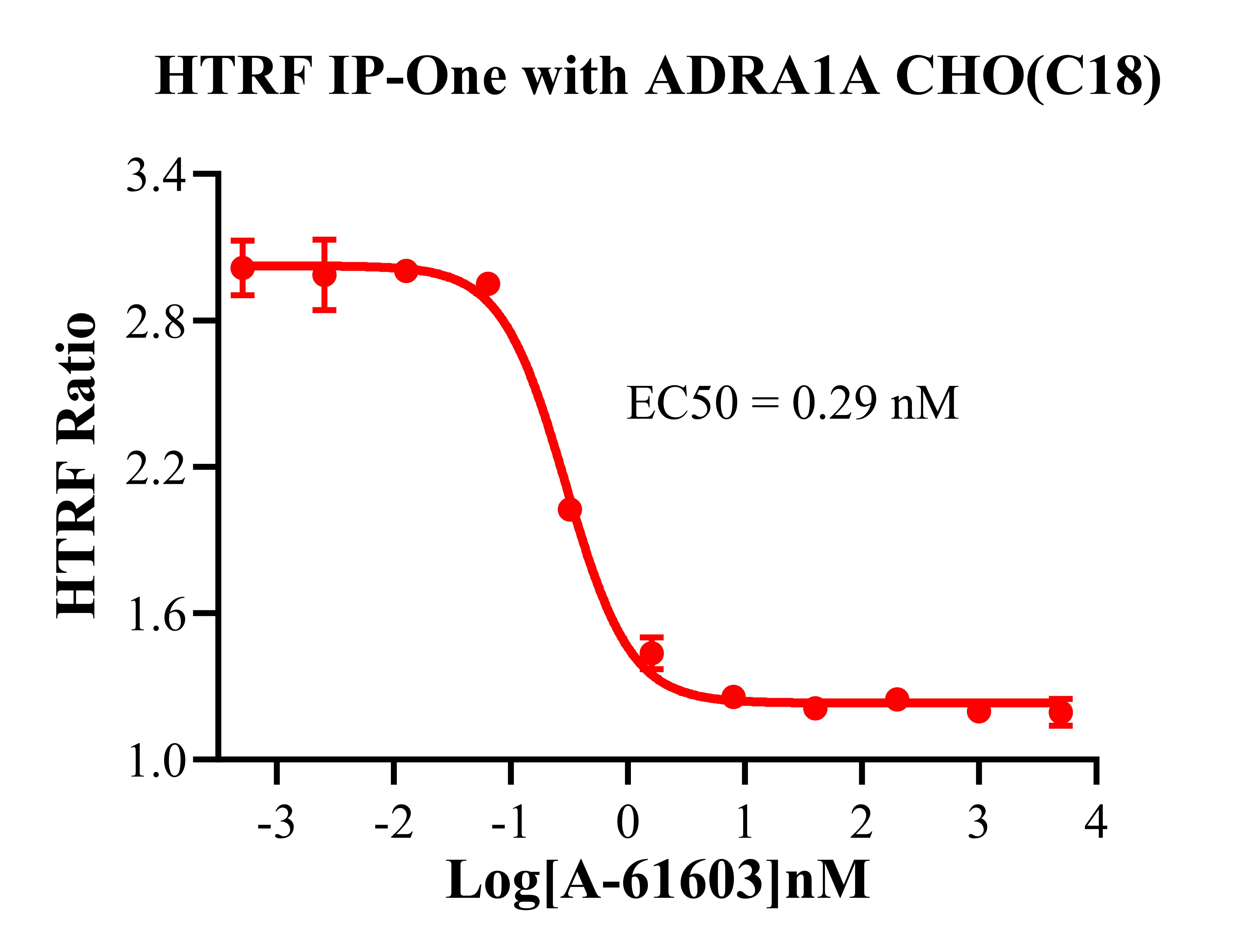 ADRA1A 還可以通過 Gq 蛋白的信號通路,調控 IP1 的升高。ADRA1A 與配體結合, 導致 Gαq 亞基的激活,觸發 PLC-γ,從而產生兩個第二信使:IP3 和 DAG,它們參與細胞內鈣動員。由于 IP3 在代謝上不穩定,因此測量通路激活的替代標志物 IP1 作為檢測標準。