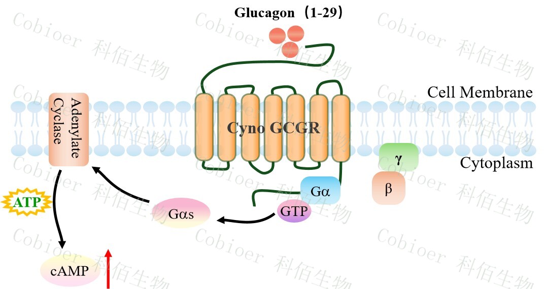 Cyno GCGR CHO 藥靶模型很好的模擬了體內(nèi) GCGR 的信號(hào)轉(zhuǎn)導(dǎo)過(guò)程,原理見下圖所示。
