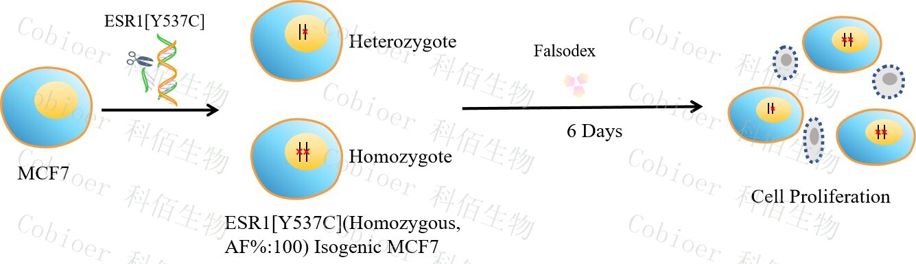 ESR1[Y537C](Homozygous,AF%:100) Isogenic MCF7 藥靶細胞,通過基因編輯的方式將 ESR1 的 537 位氨基酸酪氨酸(Y)突變為半胱氨酸(C)。![]() Figure 1. ESR1[Y537C](Homozygous,AF%:100) Isogenic MCF7 原理示意圖 |