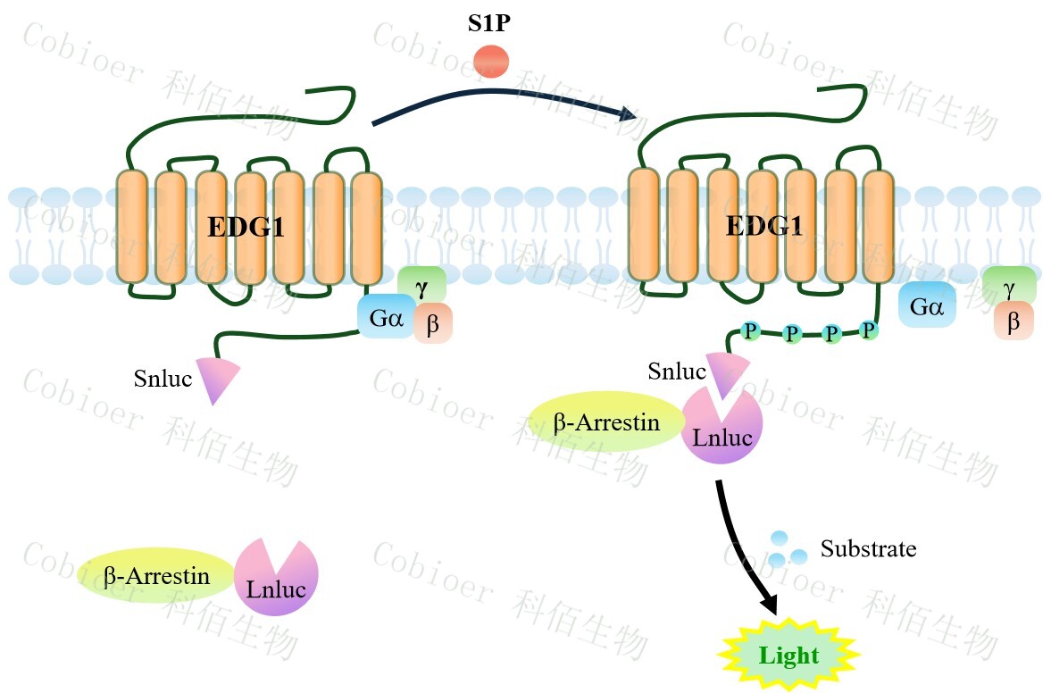 EDG1(S1P1) β-Arrestin CHO 報告基因藥靶模型很好的模擬了體內 EDG1(S1P1)/β- Arrestin 的信號轉導過程,原理見下圖所 示 。 當缺乏配體刺激時, β-Arrestin 不 與 EDG1(S1P1)結合,融合β-Arrestin 的熒光素酶處于失活構象,當 EDG1(S1P1)遭遇配體刺激 時,融合熒光素酶報告基因的β-Arrestin 被招募,使熒光素酶報告基因處于激活狀態,加入 其底物后發光信號增強。![]() Figure 1. EDG1(S1P1) β-Arrestin CHO 細胞模型原理圖 |