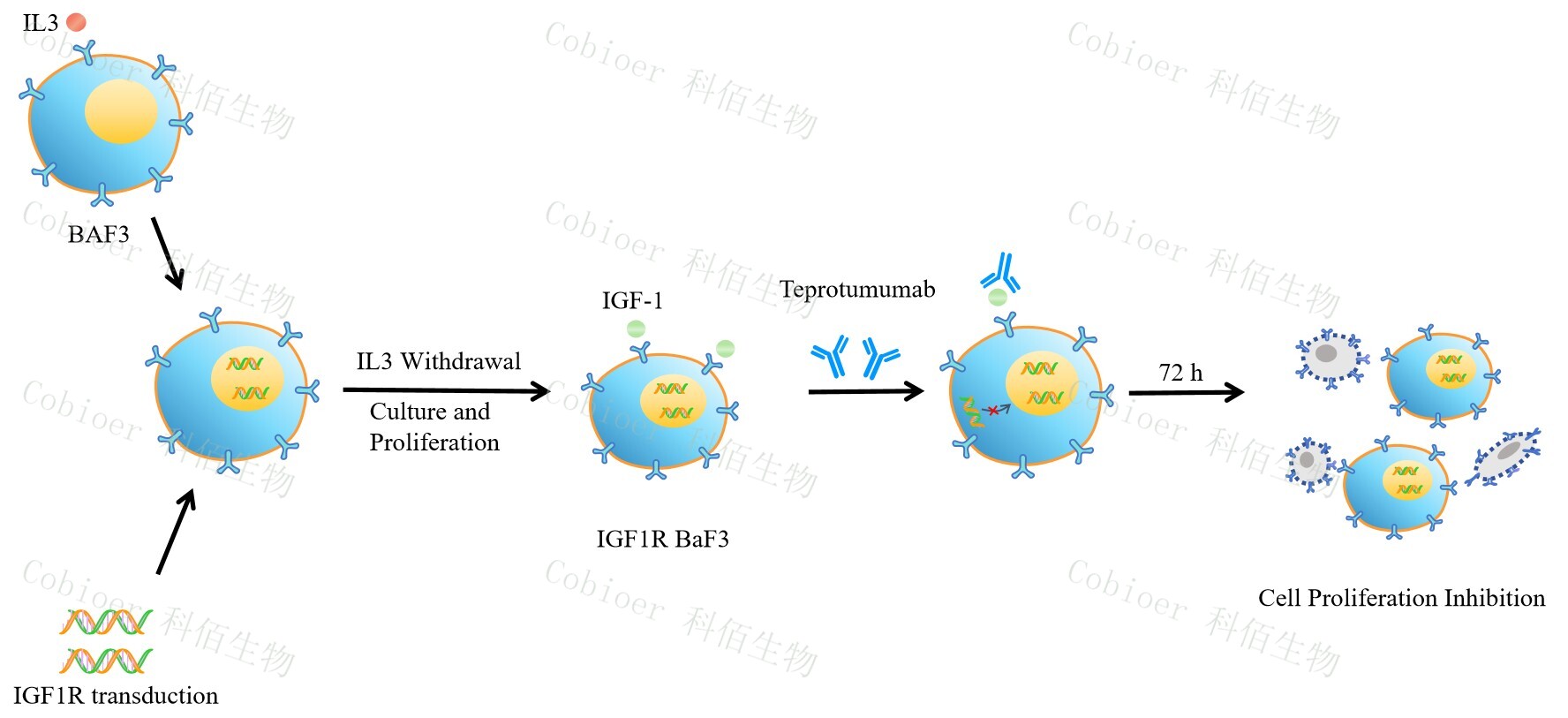 BaF3(小鼠原 B 細胞)的生長和增殖需要 IL-3 的維持。通過引入各種表達激酶的基因, 能作為 BaF3 的驅動基因,讓 BaF3 不再依賴 IL-3 而增殖,進而激酶基因成為 BaF3 增殖依 賴的驅動基因,用于評估小分子藥物對激酶的靶向抑制作用,原理及流程見下圖所示。![]() Figure 1. IGF1R BaF3 細胞模型原理圖 |