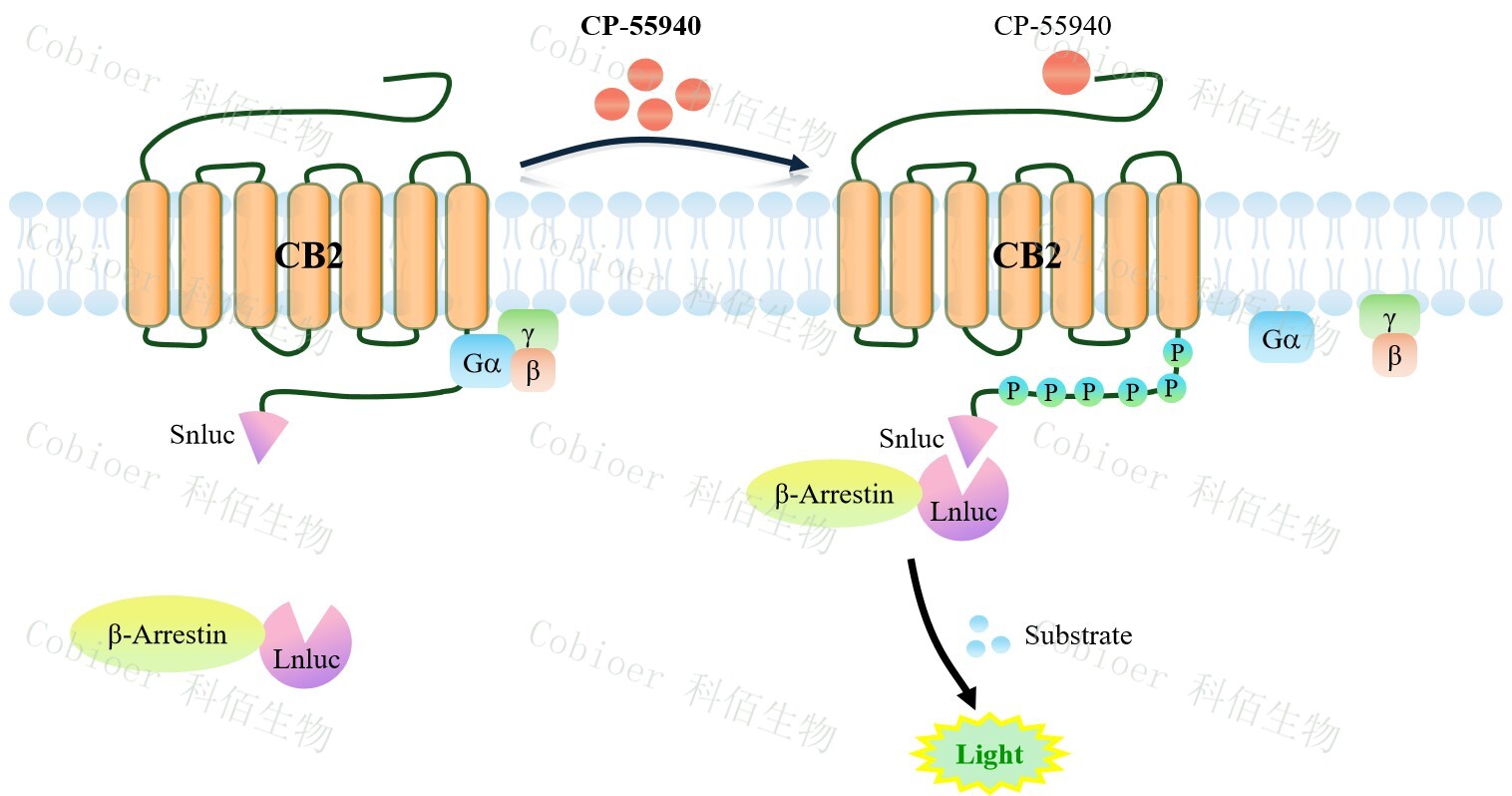 CB2 β-Arrestin CHO 報告基因藥靶模型很好的模擬了體內 CB2/β-Arrestin 的信號轉導過程,原理見下圖所示。當缺乏配體刺激時,β-Arrestin 不與 CB2 結合,融合β-Arrestin 的熒 光素酶處于失活構象,當 CB2 遭遇配體刺激時,融合熒光素酶報告基因的β-Arrestin 被招 募,使熒光素酶報告基因處于激活狀態,加入其底物后發光信號增強。![]() Figure 1. CB2 β-Arrestin CHO 細胞模型原理圖 |