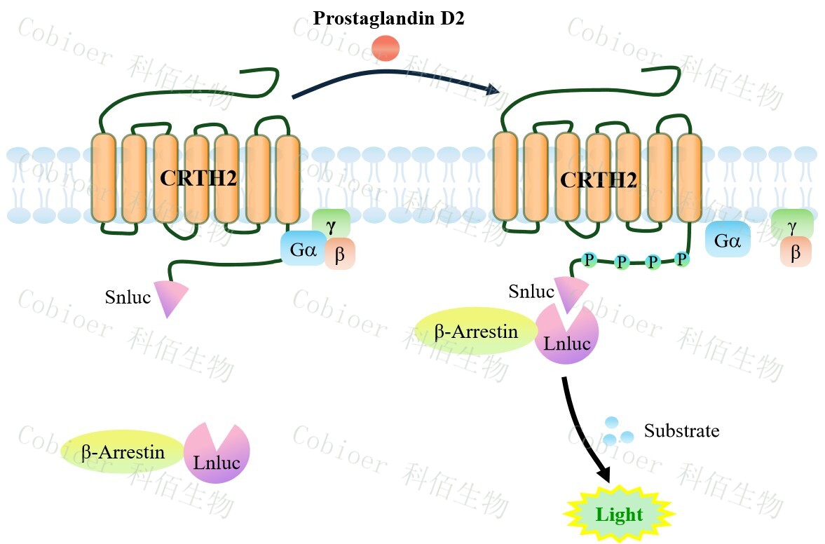 CRTH2(DP2) β-Arrestin CHO 報(bào)告基因藥靶模型很好的模擬了體內(nèi) CRTH2(DP2)/β- Arrestin 的信號轉(zhuǎn)導(dǎo)過程, 原理見下圖所示。 當(dāng)缺乏配體刺激時(shí) , β-Arrestin 不與 CRTH2(DP2)結(jié)合,融合β-Arrestin 的熒光素酶處于失活構(gòu)象,當(dāng) CRTH2(DP2)遭遇配體刺 激時(shí),融合熒光素酶報(bào)告基因的β-Arrestin 被招募,使熒光素酶報(bào)告基因處于激活狀態(tài),加 入其底物后發(fā)光信號增強(qiáng)。![]() Figure 1. CRTH2(DP2) β-Arrestin CHO 細(xì)胞模型原理圖 |