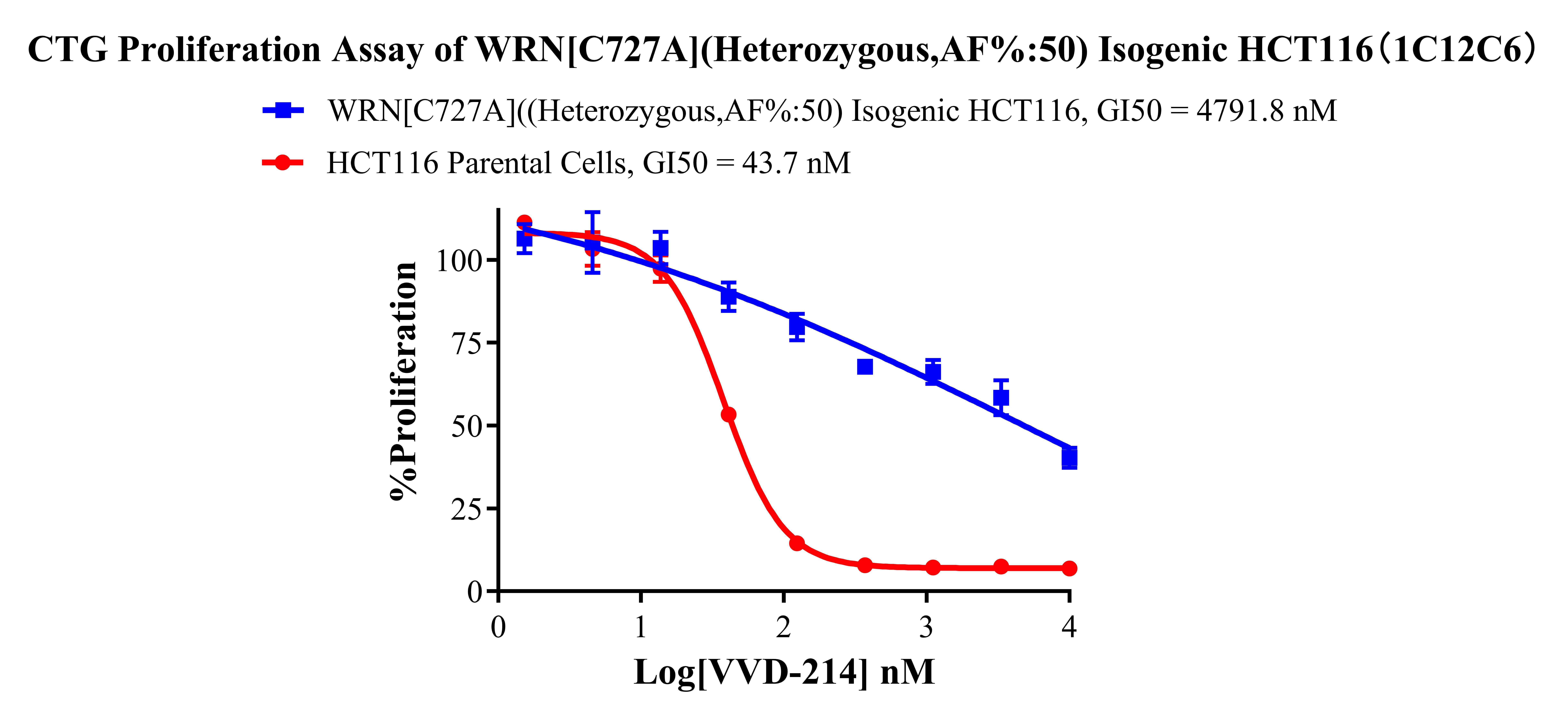 WRN[C727A](Heterozygous,AF%:50) Isogenic HCT116 藥靶細胞,通過基 因編輯的方式將 WRN 的 727 位氨基酸胱氨酸(C)突變為丙氨酸(A)。![]() Figure 1. WRN[C727A](Heterozygous,AF%:50) Isogenic HCT116 原理示意圖 |