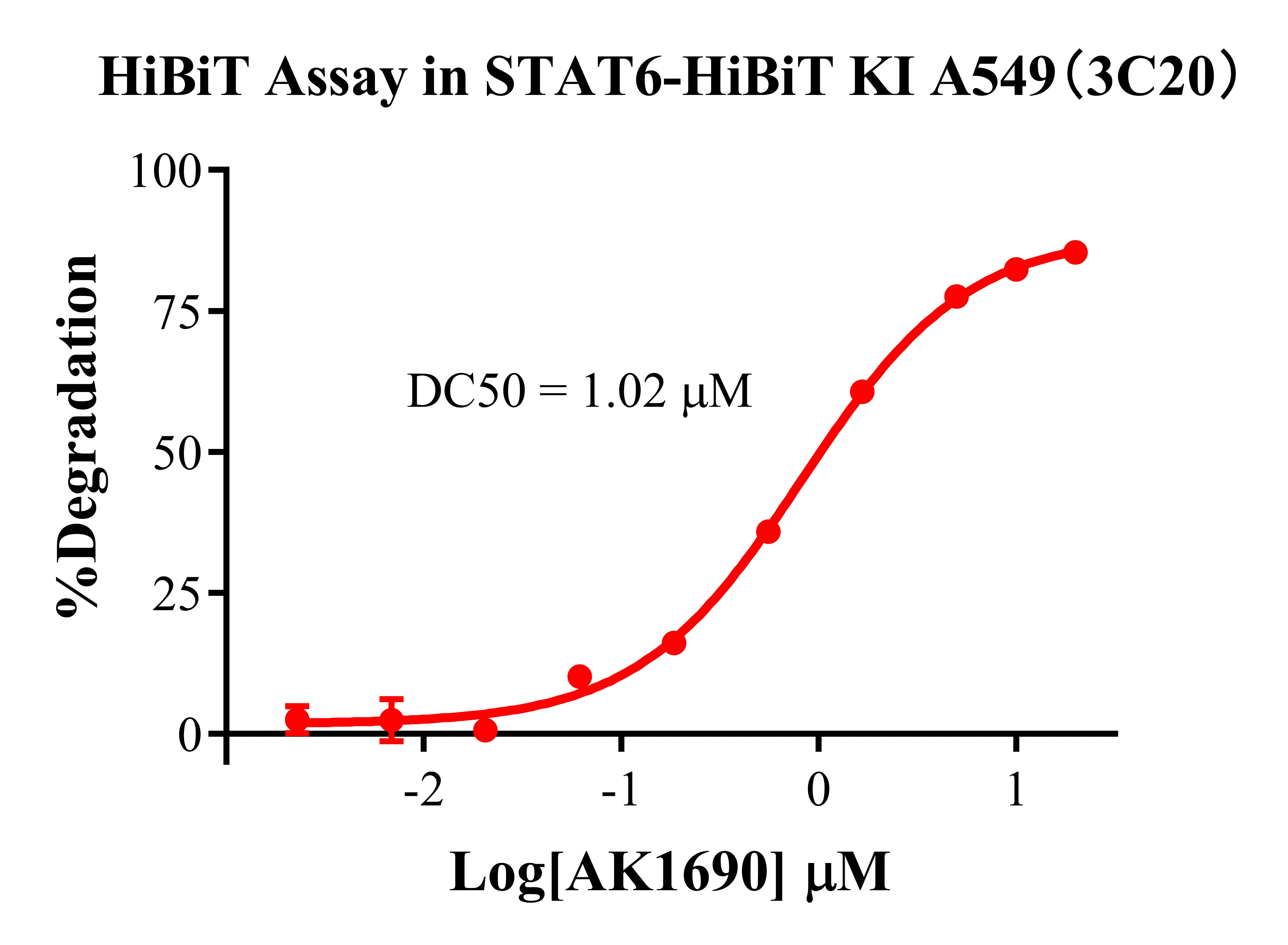 STAT6-HiBiT KI A549 報(bào)告基因細(xì)胞,通過基因編輯方式將 HiBiT 標(biāo)簽 插入細(xì)胞內(nèi)源的 STAT6 基因中。AK-1690 是一種有效和選擇性的 STAT6 PROTAC 降解劑, 原理見下圖所示。![]() Figure 1. STAT6-HiBiT KI A549 細(xì)胞模型原理圖 |