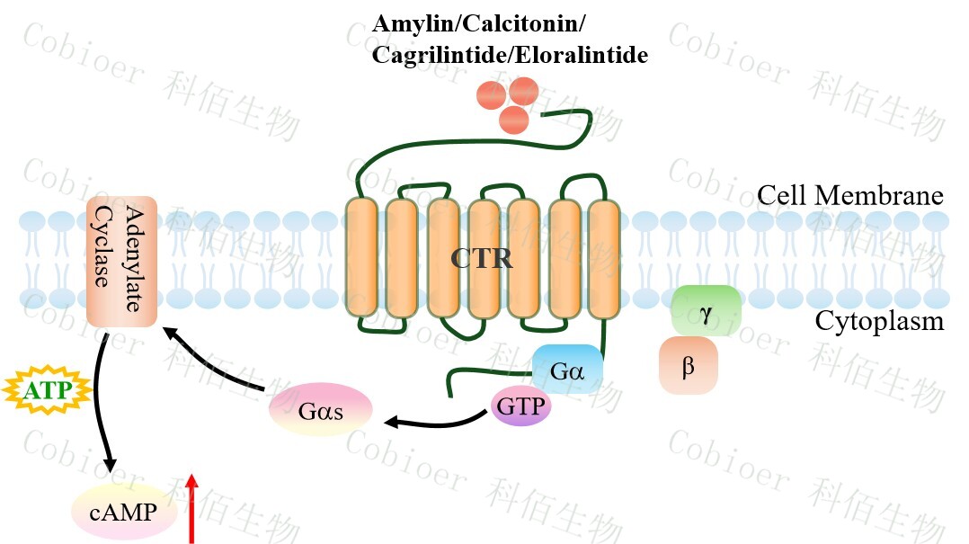 | 降鈣素基因相關肽(CGRP)家族包括 CGRP 本身、降鈣素(CT)、腎上腺髓質素 (AM)和胰島淀粉樣肽(AMY)。 胰淀素(Amylin)受體的三種類型的已被確定,即 AMY1,AMY2 和 AMY3。胰淀素 受體屬于 B 類 GPCR,是異二聚體復合物,由降鈣素受體(CTR)與受體活性修飾蛋白 (RAMPs)結合形成。該受體的 CTR 組分具有相同的 GPCR 結構:7 個跨膜相互連接的α- 螺旋,將細胞外信號傳遞到細胞內細胞質信號級聯。RAMP 有三種類型(RAMP1、 RAMP2 和 RAMP3),它們共享 31%的氨基酸序列,具有相似的基本結構。RAMP 是將 CTR 轉運到細胞膜并調節其配體特異性的重要肽,它可以改變特定 GPCR 的藥理學、功能 和細胞運輸。 哺乳動物細胞中 Amylin 受體的激活已被證明可以提高 cAMP,并被認為與 Gs 蛋白和 腺苷酸環化酶的刺激有關。在 RAMPs 的存在下,其與胰淀素的結合親和力可以被修飾。 CTR 和 RAMP1 或 CTR 和 RAMP3 的異質結構被認為有利于與胰淀素結合,介導大腦中的 生理功能。AMY3 的激活刺激 G 蛋白 Gαs,進一步控制腺苷酸環化酶(AC),隨后增加細 胞 cAMP。cAMP 與 PKA 調控亞基(R2)的結合誘導 PKA 四聚體全酶解離,導致 PKA 催 化亞基的激活。cAMP 激活的 PKA 參與調控 ERK1/2 的活性。ERK1/2 通路的觸發可能導致 Ca 2+分布不均勻,引發內質網和線粒體功能障礙,導致細胞死亡。此外,cAMP 刺激 AKT 進一步導致轉錄因子 cFos 的表達。 |