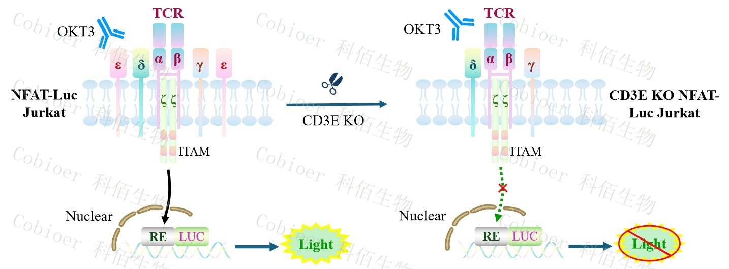 CD3E KO NFAT-Luc Jurkat 報告基因藥靶模型很好的模擬了體內 TCR 的信號轉導過程, 原理見下圖所示。![]() Figure 1. CD3E KO NFAT-Luc Jurkat 細胞模型原理圖 |