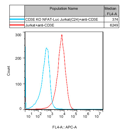 ![]() Figure 2. CD3E(NM_000733.4):c.397_398ins4bp/CD3E:p.I133Kfs ![]() Figure 3. Recombinant CD3E KO NFAT-Luc Jurkat stably expressing CD3E. ![]() Figure 4. Dose Response of CD3 Agonist Antibody in CD3E KO NFAT-Luc Jurkat (2C24)