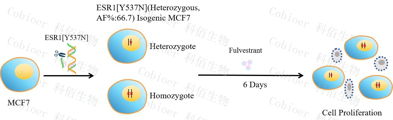 ESR1[Y537N](Heterozygous,AF%66.7) Isogenic MCF7 藥靶細胞,通過基 因編輯的方式將 ESR1 的 537 位氨基酸酪氨酸(Y)突變為天冬酰胺(N)。![]() Figure 1. ESR1[Y537N](Heterozygous,AF%66.7) Isogenic MCF7 原理示意圖 |