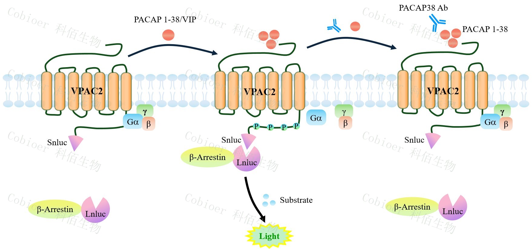 VPAC2 β-Arrestin CHO 報告基因藥靶模型很好的模擬了體內 VPAC2/β-Arrestin 的信號轉導過程,原理見下圖所示。當缺乏配體刺激時,β-Arrestin 不與 VPAC2 結合,融合β- Arrestin 的熒光素酶處于失活構象,當 VPAC2 遭遇配體刺激時,融合熒光素酶報告基因的 β-Arrestin 被招募,使熒光素酶報告基因處于激活狀態,加入其底物后發光信號增強。![]() Figure 1. VPAC2 β-Arrestin CHO 細胞模型原理圖 |