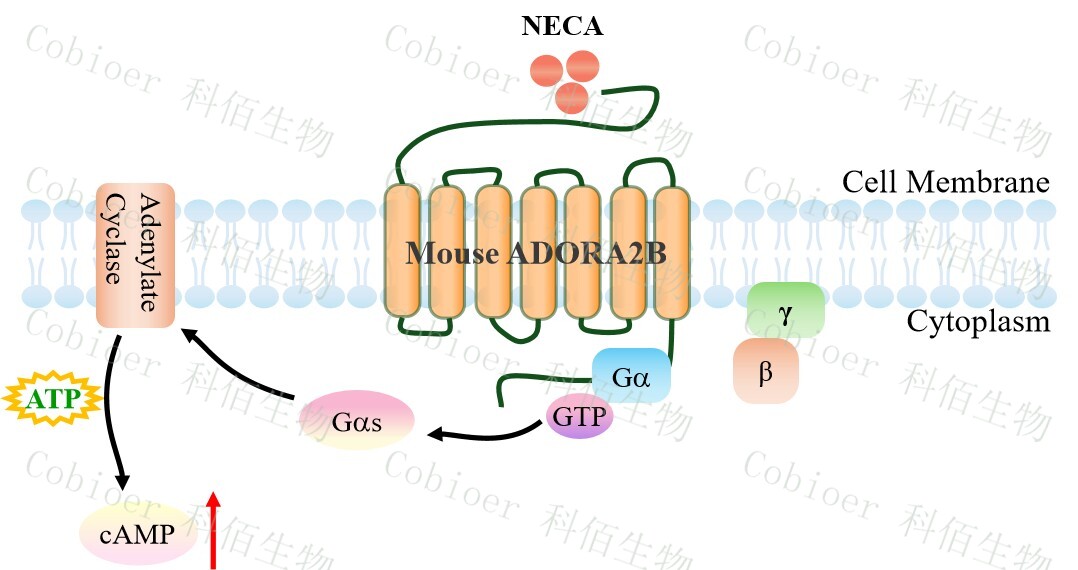 cAMP 在 G 蛋白偶聯受體(GPCR)信號轉導中是一種關鍵的第二信使。當配體結合 到 GPCR,構象發生變化,激活受體接著激活 G 蛋白,Gs 的激活導致腺苷酸環化酶調控 cAMP 的升高。
