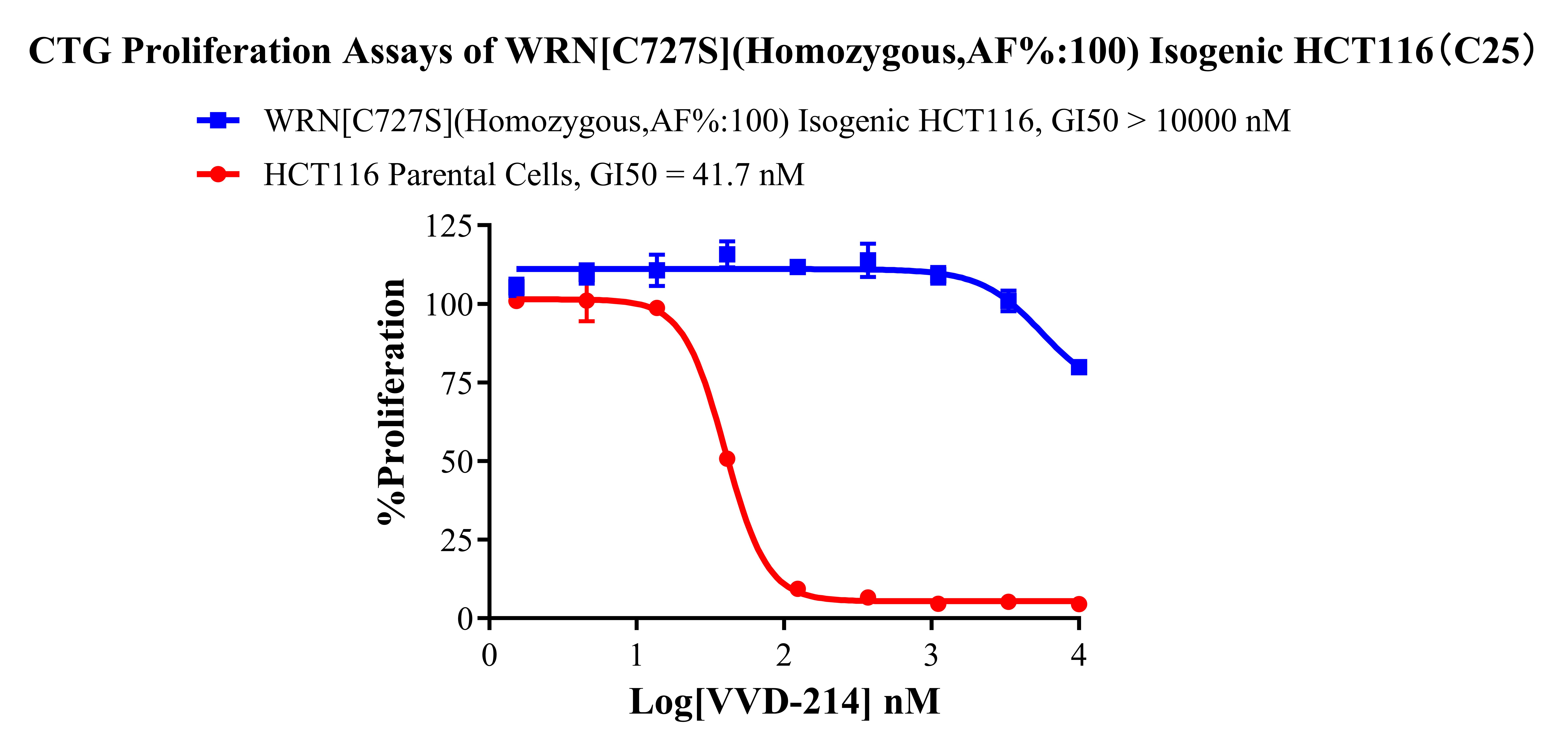 ![]() Figure 1. A:HCT116 Parental Cell;B:WRN[C727S](Homozygous,AF%:100) Isogenic HCT116 通道2 藍色微滴代表WRN[C727S]突變陽性,通道2 綠色微滴代表該位點為陰性野生型 ![]() Figure 2. CTG Proliferation Assays of WRN[C727S](Homozygous,AF%:100)Isogenic HCT116(C25). ![]() Figure 3. CTG Proliferation Assays of WRN[C727S](Homozygous,AF%:100) Isogenic HCT116(C25). |