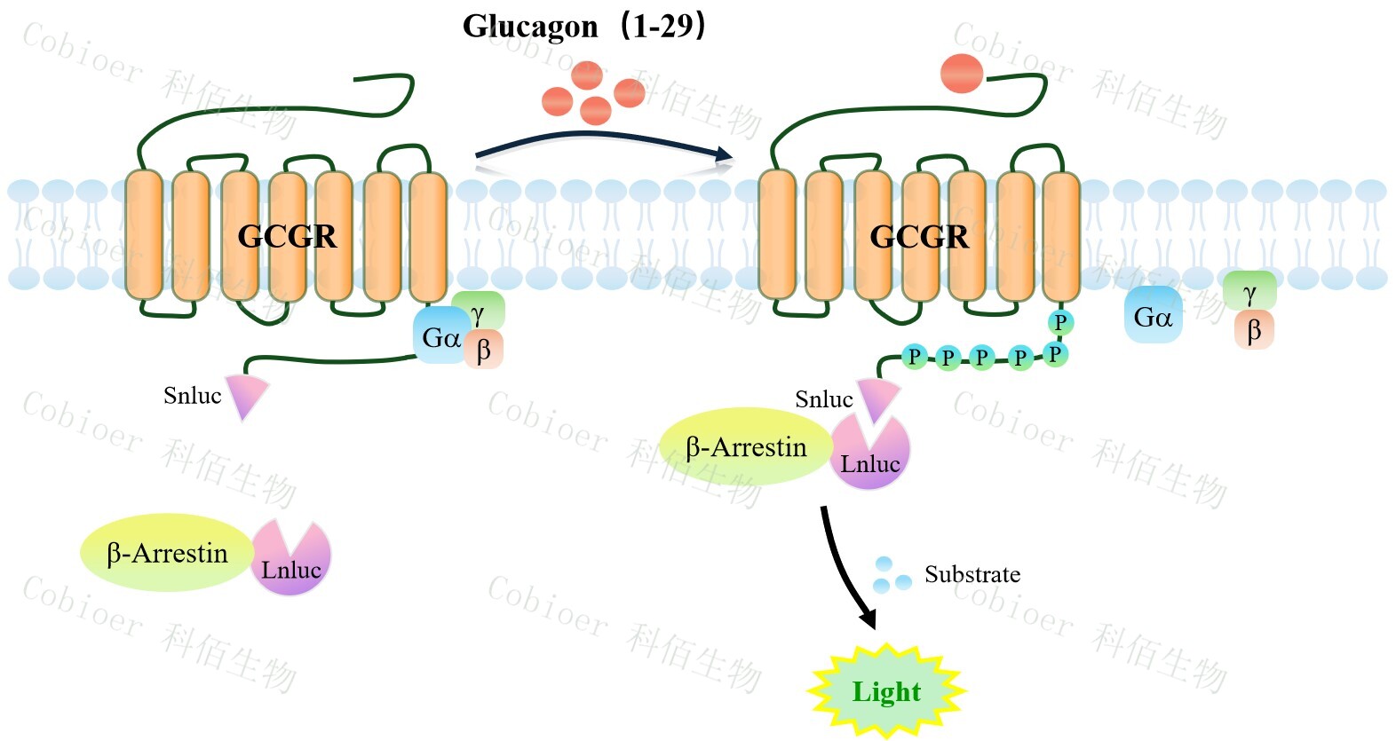GCGR β-Arrestin CHO 報(bào)告基因藥靶模型很好的模擬了體內(nèi) GCGR/β-Arrestin 的信號轉(zhuǎn) 導(dǎo)過程,原理見下圖所示。當(dāng)缺乏配體刺激時(shí),β-Arrestin 不與 GCGR 結(jié)合,融合β- Arrestin 的熒光素酶處于失活構(gòu)象;當(dāng) GCGR 遭遇配體刺激時(shí),融合熒光素酶報(bào)告基因的β- Arrestin 被招募,使熒光素酶報(bào)告基因處于激活狀態(tài),加入其底物后發(fā)光信號增強(qiáng)。![]() Figure 1. GCGR β-Arrestin CHO 細(xì)胞模型原理圖 |