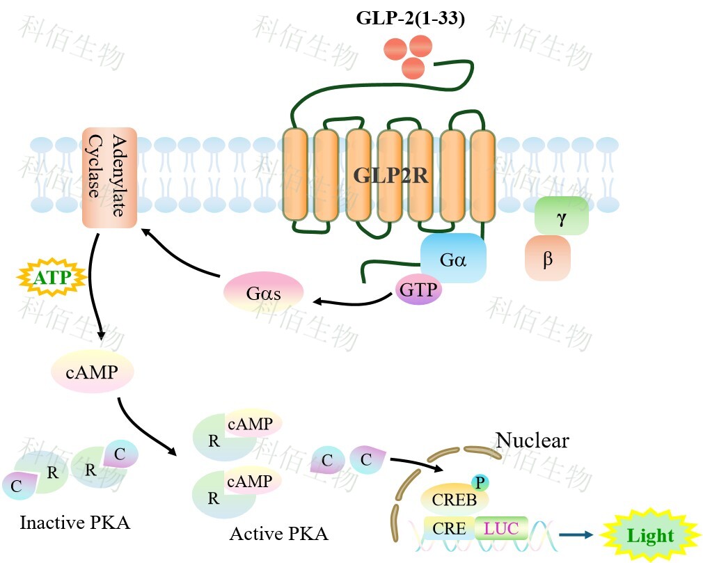 GLP2R CRE-Luc HEK293 報告基因藥靶模型很好的模擬了體內 GLP2R 的信號轉導過程,原理見下圖所示。