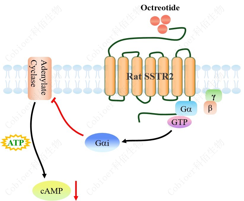 | 生長(zhǎng)抑素受體(Somatostatin receptor,SSTRs)是 GPCR 超家族中的 class A 家族的成 員,共有 5 種亞型,分別為 SSTR1-SSTR5,其中 SSTR2 是唯一一種有 SSTR2a 和 SSTR2b 這 2 種異構(gòu)體的 SSTR 亞型受體蛋白。SSTR2 廣泛分布于正常組織中,如腦下垂體、胰島、 腎上腺、胸腺、胃腸道以及免疫系統(tǒng)等,在不同受體的組織,表達(dá)譜各不相同。 SSTR2 與其它同家族受體一樣,在結(jié)合內(nèi)源性多肽配體 SST 后可以與 Gi 蛋白偶聯(lián), 通過調(diào)節(jié)腺苷酸環(huán)化酶活性進(jìn)而抑制環(huán)腺苷酸的合成,將外源信號(hào)傳遞至胞內(nèi),從而參與 調(diào)節(jié)多種激素的分泌,抑制細(xì)胞生長(zhǎng)增殖。SSTR 還能激活 K+通道,促進(jìn)細(xì)胞膜超極化, 抑制門控 Ca 2+通道的激活,進(jìn)而阻礙 Ca 2+ 內(nèi)流,抑制胞吐,抑制荷爾蒙的分泌功能。當(dāng) SSTR2 或其它亞型與 SST 結(jié)合后,可以通過蛋白酪氨酸磷酸途徑,SSTR 導(dǎo)致蛋白酪氨酸 磷酸酶(PTP)上調(diào),使酪氨酸激酶去磷酸化而失活,并抑制促絲裂原活化蛋白激酶 (MAPK)等多種蛋白激酶,抑制癌基因、c-fos、c-mys、c-jun 等轉(zhuǎn)錄激活,從而抑制 DNA 和蛋白質(zhì)的合成。SSTR2 在神經(jīng)母細(xì)胞瘤、垂體腺瘤、黑色素瘤、甲狀腺癌以及許多 神經(jīng)內(nèi)分泌腫瘤中高表達(dá)。 |