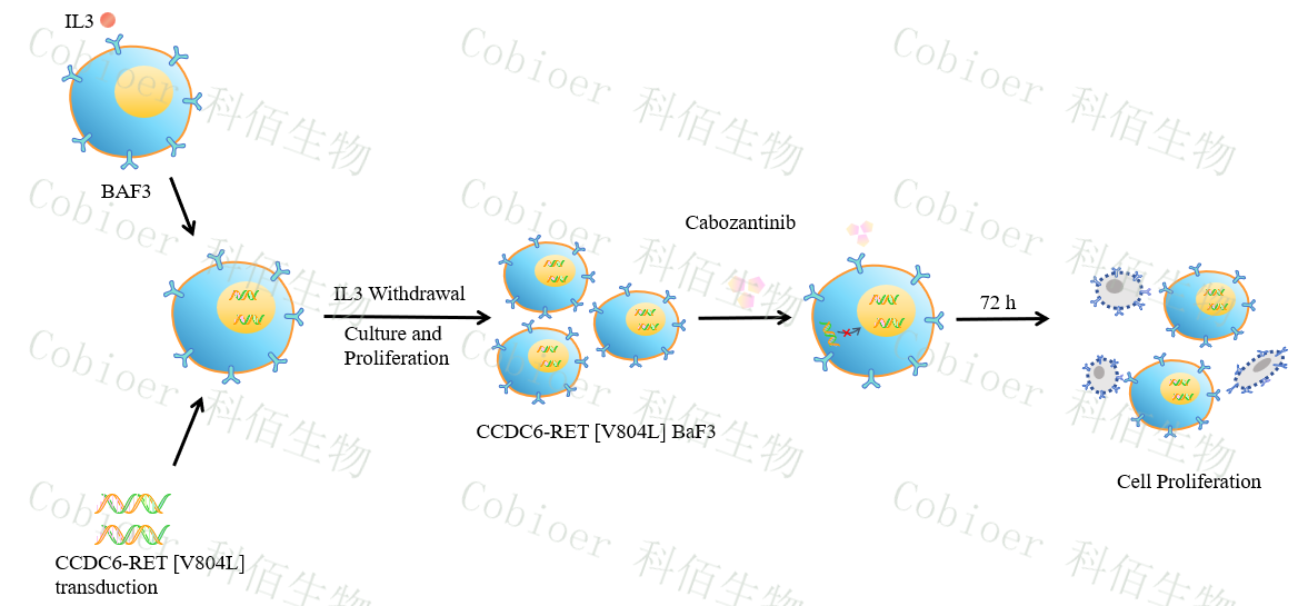 BaF3(小鼠原 B 細胞)的生長和增殖需要 IL-3 的維持。通過引入各種表達激酶的基因, 能作為 BaF3 的驅動基因,讓 BaF3 不再依賴 IL-3 而增殖,進而激酶基因成為 BaF3 增殖依 賴的驅動基因,用于評估小分子藥物對激酶的靶向抑制作用,原理及流程見下圖所示。