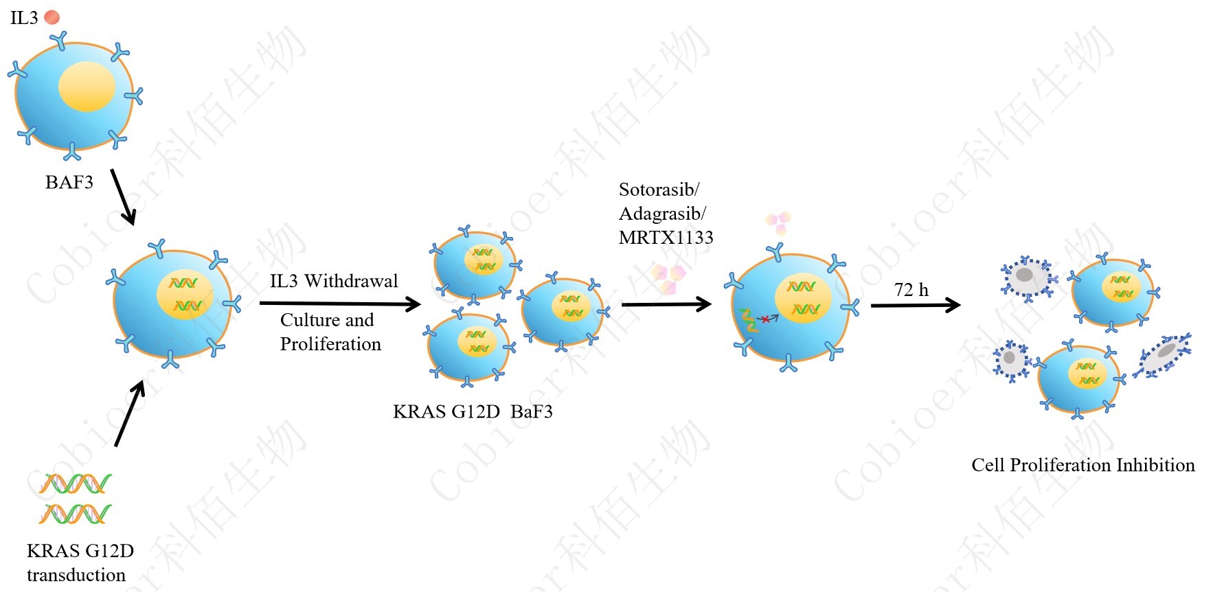 BaF3(小鼠原 B 細胞)的生長和增殖需要 IL-3 的維持。通過引入各種表達激酶的基因, 能作為 BaF3 的驅動基因,讓 BaF3 不再依賴 IL-3 而增殖,進而激酶基因成為 BaF3 增殖依賴的驅動基因,用于評估小分子藥物對激酶的靶向抑制作用,原理及流程見下圖所示。
