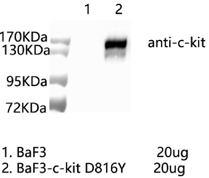 | KIT D816Y lies within the tyrosine kinase domain 2 of the Kit protein. D816Y results in constitutive phosphorylation of Kit, activation of Akt and Mapk pathways in cultured cells, and confers resistance to imatinib in culture. | |