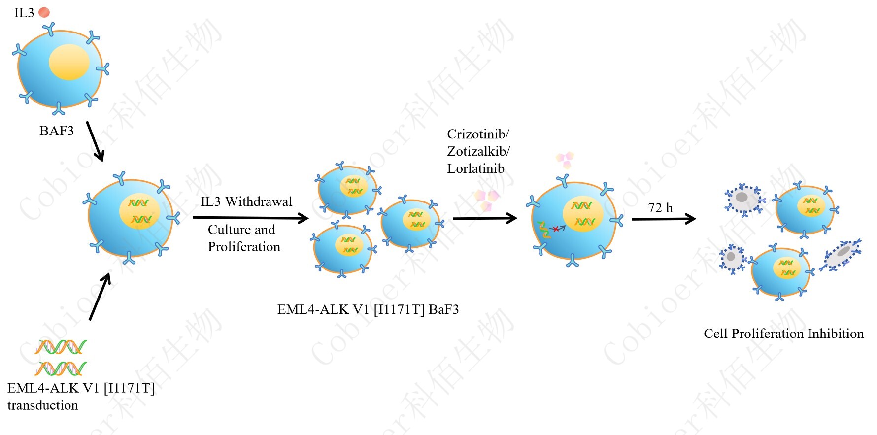 BaF3(小鼠原 B 細胞)的生長和增殖需要 IL-3 的維持。通過引入各種表達激酶的基因, 能作為 BaF3 的驅動基因,讓 BaF3 不再依賴 IL-3 而增殖,進而激酶基因成為 BaF3 增殖依 賴的驅動基因,用于評估小分子藥物對激酶的靶向抑制作用,原理及流程見下圖所示。