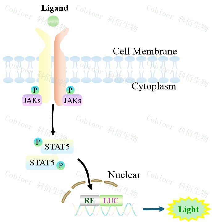 STAT5-Luc TF1 報告基因細(xì)胞,是由 STAT5 調(diào)控并表達 Luc 熒光素酶報 告基因的 TF1 細(xì)胞。GM-CSF 與受體結(jié)合,激活 STAT5 的原理見下圖所示。![]() Figure 1. STAT5-Luc TF1 細(xì)胞模型原理圖 |