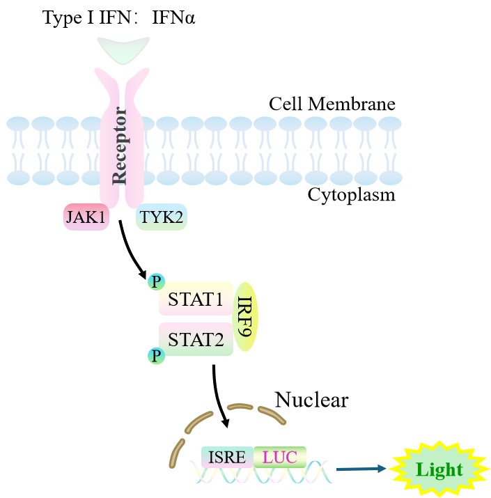 ISRE-Luc HEK293 報告基因細胞是由 ISRE 調控并表達 Luc 熒光素酶 報告基因的 HEK293 細胞。IFN 與受體結合,激活 ISRE 的原理見下圖所示。