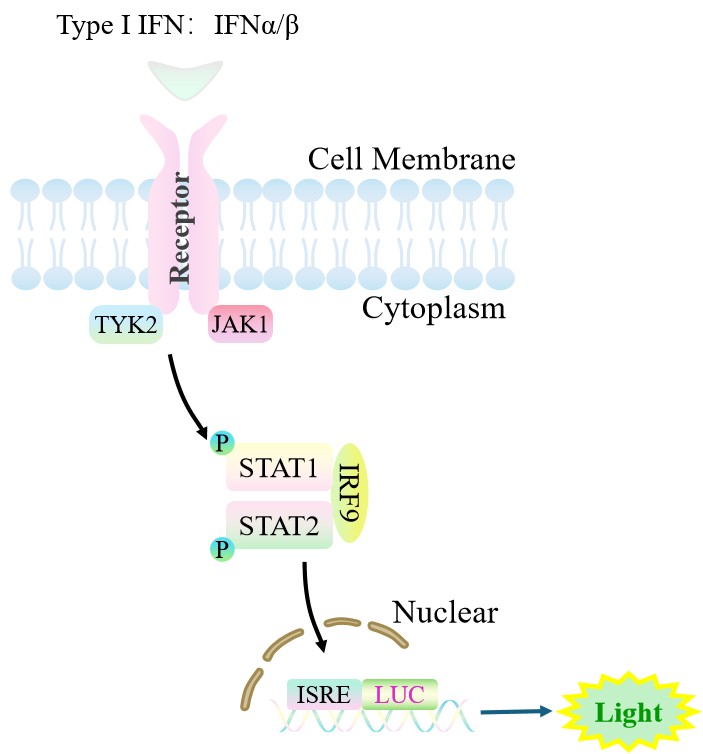 ISRE-Luc THP-1 報(bào)告基因細(xì)胞是由 ISRE 調(diào)控并表達(dá) Luc 熒光素酶報(bào) 告基因的 THP-1 細(xì)胞。IFN 與受體結(jié)合,激活 ISRE 的原理見(jiàn)下圖所示。