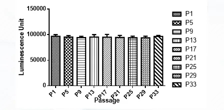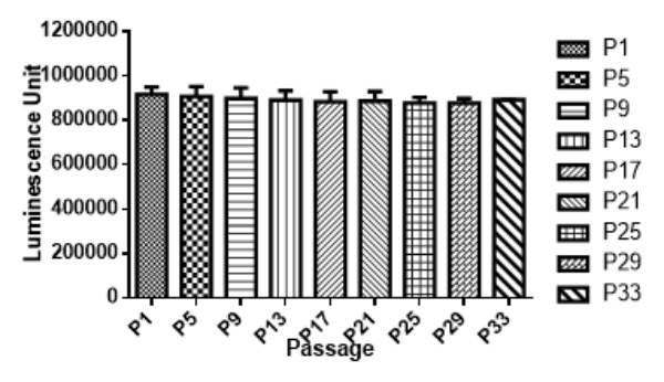 4. 示蹤細胞體外發光測試,測定發光信號強度和細胞傳代信號穩定性,確保示蹤細胞在體外和體內都能穩定高水平表達標記蛋白,以科佰生物A549-Luc細胞為例: