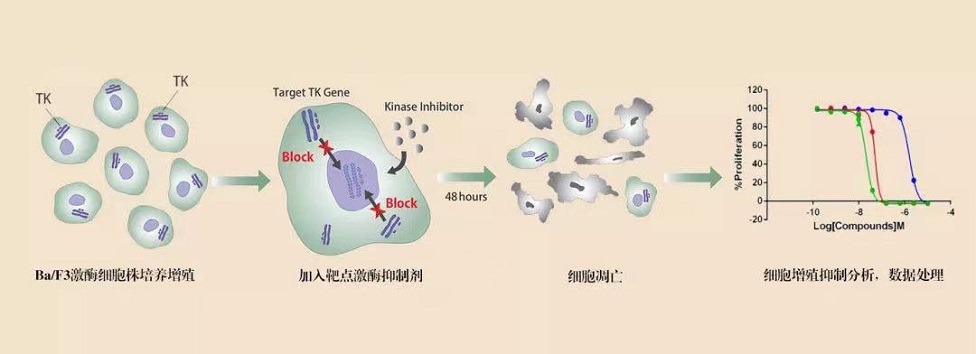 我們結(jié)合自己多年在細胞領(lǐng)域的豐富經(jīng)驗,在 Ba/F3(小鼠原B細胞)上進行改造,引入相應表達激酶基因,這些基因能作為Ba/F3的驅(qū)動基因,讓Ba/F3不再依賴IL-3而增殖,進而激酶基因成為Ba/F3增殖依賴的驅(qū)動基因,用于評估小分子藥物對激酶的靶向抑制作用。