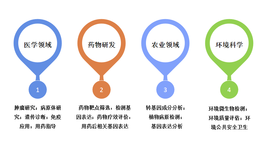 實時熒光定量PCR具有靈敏度高、特異性強、快速高效的特點,廣泛應用于生物醫藥、臨床診斷、農業、環境科學等多個領域,常用于檢測基因表達、基因變異、轉基因等。