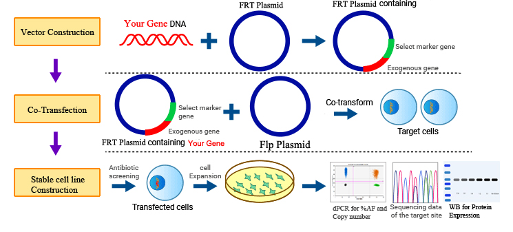 Flp-FRT整合系統是一種用于構建穩定細胞系的方法,該細胞系可在宿主細胞基因組的特定位置表達目的基因。該系統利用 Flp 重組酶和 FRT(Flp 重組靶位)位點實現位點特異性重組和整合。該系統可實現目的基因的穩定表達,確保細胞中蛋白質的持續生產。