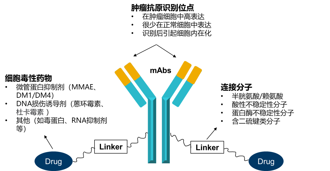 ADC(Antibody-drug conjugate,ADC)藥物全稱為抗體偶聯藥物,是將抗體通過偶聯臂(Linker)與小分子藥物(Payload)共價連接的復合物??贵w負責靶向病灶,毒素通過自身特性殺傷目標細胞,連接子則是承擔橋接毒素和抗體直至ADC到達腫瘤細胞內再進行釋放的功能。一個理想的ADC分子應該具備高靶點特異性、高腫瘤殺傷能力、長藥代特性、低免疫原性、低脫靶毒性。