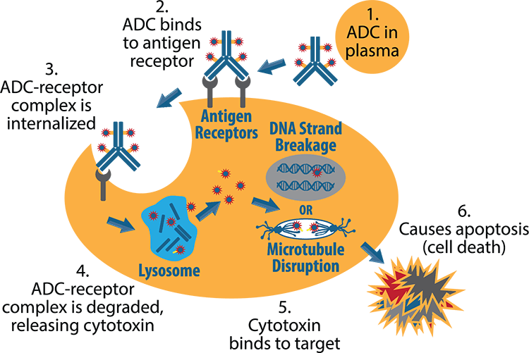 ADC藥物通過靜脈注射到血液中,隨著血液的流動,到達全身,但是科學家估計只有0.1%的ADC能到達患者的癌細胞。大部分會在循環系統和其他器官及組織中逐漸分解。到達癌細胞的ADC藥物一般是經歷6個過程來起作用。