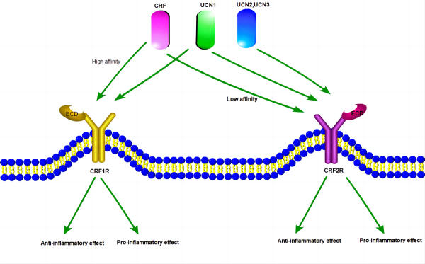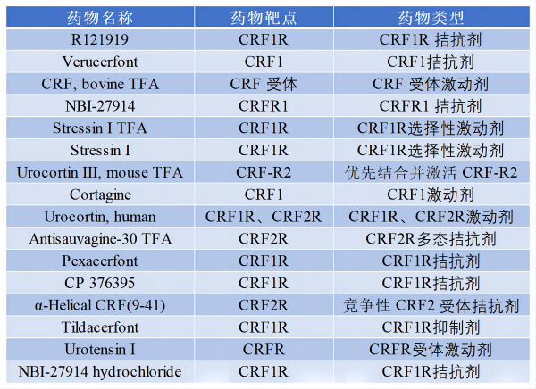 CRF1R和CRF2R主要是通過偶聯下游Gs蛋白參與體內內分泌系統、行為系統和免疫系統的壓力應答。CRF1R和CRF2R在體內被內源性配體CRF和UCN1-3 激活。與UCN1對CRF1R和CRF2R都有高親和力不同,CRF對CRF1R的親和力明顯高于CRF2R,而UCN2和UCN3則表現出了對CRF2R選擇性激動劑的活性。