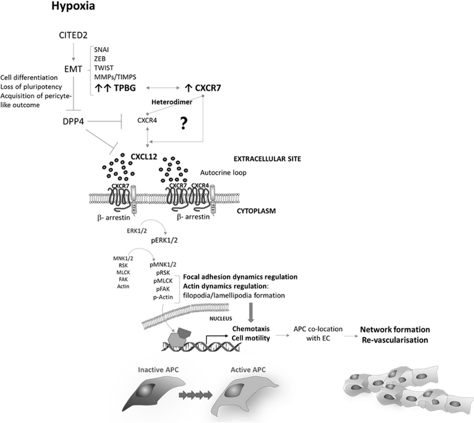 CXCL12和CXCR4表達(dá)與許多腫瘤的發(fā)生有關(guān),有研究表明CXCR4的表達(dá)有助于癌細(xì)胞擴(kuò)散到CXCL12高表達(dá)的組織中,比如肺、肝、淋巴結(jié)和骨髓。在小鼠胚胎干細(xì)胞、成纖維細(xì)胞和癌細(xì)胞中,TPBG的上調(diào)與CXCL12的誘導(dǎo)有關(guān)。TPBG通過抑制負(fù)責(zé)CXCL12裂解的蛋白酶DPP4來延長(zhǎng)CXCL12的生物利用度。CXCL12通過結(jié)合CXCR4以及非典型CXCR7和CXCR4/CXCR7異源二聚體觸發(fā)細(xì)胞內(nèi)信號(hào)傳導(dǎo)。CXCR4和CXCR7也可以與β-arrestin-2形成復(fù)合物,從而促進(jìn)受體內(nèi)化并將信號(hào)重定向到其他不依賴G蛋白的途徑如p38 MAPK/ERK 信號(hào)通路。在某種程度上說明5T4可通過CXCR4/CXCL12通路來影響腫瘤細(xì)胞的發(fā)生、發(fā)展、轉(zhuǎn)移等。