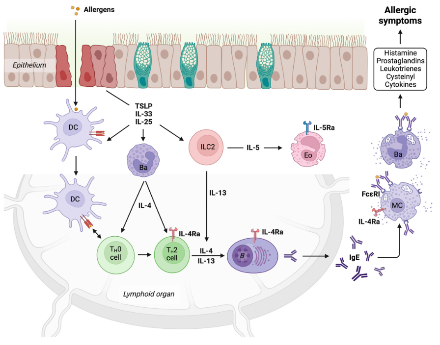過敏的病因與Ⅱ型炎癥反應密切相關(guān),會導致過敏原特異性免疫球蛋白E(IgE)的產(chǎn)生,這是許多過敏性疾病的關(guān)鍵驅(qū)動因素。在高水平上,初始的過敏原暴露會破壞上皮的完整性,通過包括IL-25、IL-33和TSLP在內(nèi)的細胞因子觸發(fā)局部炎癥,這些炎癥激活Ⅱ型先天淋巴樣細胞以及其他免疫細胞來分泌Ⅱ型細胞因子IL-4、IL-5和IL-13,促進Th2細胞的發(fā)育和嗜酸性粒細胞的招募。Th2細胞依賴的B細胞激活促進了過敏原特異性IgE的產(chǎn)生,IgE穩(wěn)定地與嗜堿性細胞和肥大細胞表面的Fc段含高親和力受體(FcεRI)結(jié)合。在過敏原再次暴露后,這些細胞迅速脫粒導致過敏癥狀。