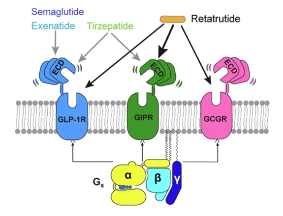 GCGR(胰高血糖素受體)是一種B類GPCR,最初被描述為與腺苷酸環化酶功能相連的胰高血糖素結合體。GCGR促進肝糖原分解、脂肪氧化和能量消耗,但過度激活可能導致高血糖。與GLP-1R聯用可抵消升糖風險,同時增強減重效果。
