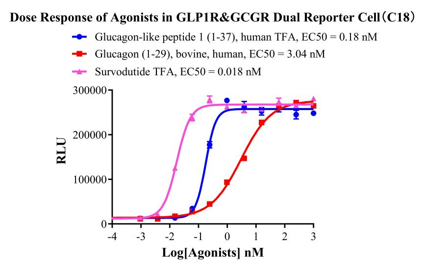 為助力雙靶點藥物研發,南京科佰開發了GLP1R&GCGR Dual Reporter Cell和GLP1R&GIPR Dual Reporter Cell細胞篩選模型,產品驗證結果如下: