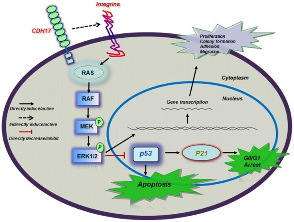 另有研究結果表明,CDH17間接影響整合素以穩定其結構和活性。在人胃癌細胞MGC-803,CDH17過表達能夠激活Ras/Raf/MEK/ERK信號通路,促進細胞在體內的致瘤性。