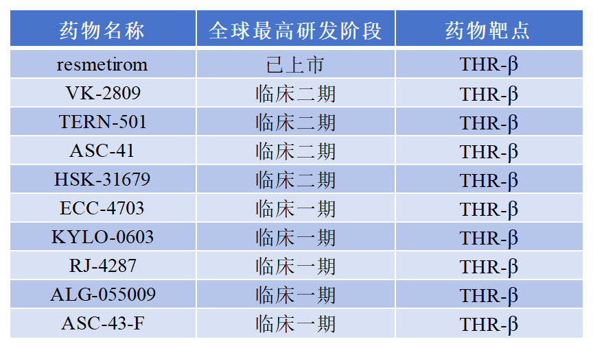 目前,進度最快的為Madrigal公司的Resmetirom,已批準上市resmetirom是第一個口服小分子肝導向的β-選擇性THR激動劑。