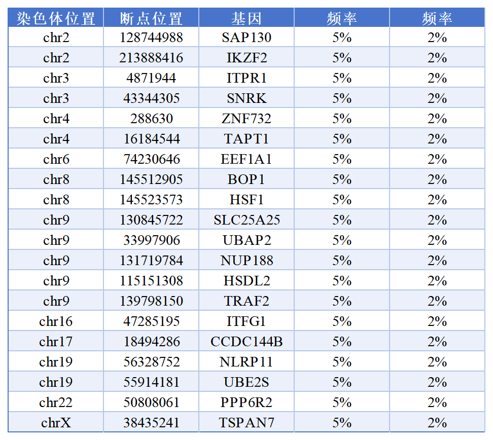 目前檢測ISA的方法有LM-PCR、NGS、單細胞測序等,為了保證檢測的準確性,科佰生物開發了一系列慢病毒整合位點標準品供檢測機構使用,作為品質衡量的標尺對檢測能力進行判別。在前文 慢病毒整合位點標準品強勢來襲一文中,已對單克隆多插入位點、單克隆單插入位點、性染色體插入位點 做了產品的說明及數據展示。近期科佰推出了5% 2% 整合頻率的慢病毒多克隆多整合位點參考品,由多個單克隆整合位點產品混合而來,覆蓋20個插入位點,分別來自11個不同染色體上的20個基因,如下表所示