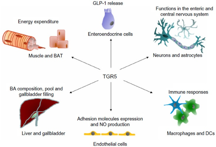 TGR5在多種細胞類型中被研究,如肌肉細胞、脂肪細胞、內皮細胞(ECs)和巨噬細胞。TGR5的功能依賴于細胞類型,從胰高血糖素樣肽-1 (GLP-1)的釋放和線粒體能量穩態到炎癥反應的控制。