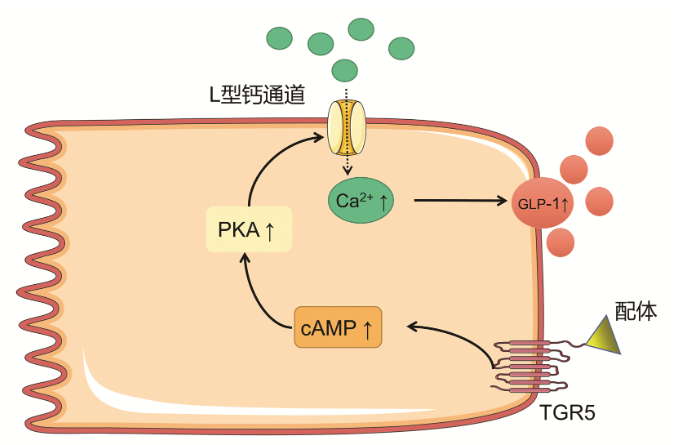 TGR5在維持葡萄糖穩態和胰島素敏感性方面上的效果已得到廣泛證明。例如,使用TGR5激動劑6α-乙基-23(S)-甲基-膽酸(6α-ethyl-23(S)-methyl-cholic acid,INT-777)可以提高肥胖小鼠的胰島素敏感性,7-硫酸膽酸以TGR5依賴性方式增加胰島素抵抗小鼠的葡萄糖耐量等。機體各組織的TGR5可通過不同的分子機制參與血糖代謝的調節。TGR5對于血糖代謝的作用,主要與腸促胰島素釋放相關,通過刺激腸內分泌L細胞分泌GLP-1來實現。既往研究發現,GLP-1可促進胰島素分泌,促進胰島β細胞存活和增殖,抑制細胞凋亡,并且可有效刺激2型糖尿病患者的胰島素分泌并降低血糖。早期觀點認為TGR5被激活后刺激腸內分泌L細胞內cAMP水平增加,線粒體氧化磷酸化增加,ATP/ADP比例增加,導致ATP依賴性鉀離子通道(KATP)關閉,開放鈣離子通道,促進鈣離子內流,釋放GLP-1。但后續大量研究驗證了GLP-1的分泌確實與cAMP升高,胞內鈣離子升高有關,但與ATP依賴性鉀離子通道無關。Brighton等的實驗進一步驗證了GLP-1分泌與L細胞內的cAMP和Ca2+濃度變化有關,并且說明了該作用主要由位于基底外側L細胞膜上的TGR5介導。近年來,Goldspink等發現腸L細胞上的TGR5被激活后,通過cAMP/PKA途徑,開放了L型Ca2+通道,促進Ca2+內流,引發GLP-1分泌。