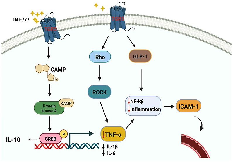 有報道稱,在慢性炎癥反應中,TNF-α可激活多種半胱天冬酶,導致炎癥細胞凋亡。TGR5已被發現通過調節Rho/Rho相關蛋白激酶(ROCK)信號通路來調節TNF-α。作為TGR5的激動劑,INT-777可以阻斷TNF-α誘導的RMEC增殖和遷移,抑制TNF-α促進血管通透性的作用。此外,已有證據表明,TGR5激動劑可以通過激活TGR5- camp蛋白激酶A (PKA)信號通路,上調IL-10的表達,發揮抗炎和免疫抑制作用,降低促炎細胞因子IL-1β、IL-6和TNF-α的表達。有研究表明,GLP-1可通過抑制NF-κB延緩ECs的損傷,進而抑制IL-1β、IL-6、TNF-α等炎癥因子的分泌。而各種研究證實GLP-1是TGR5的靶點之一;其分泌依賴于TGR5。因此,推測激活TGR5可能是刺激GLP-1分泌、延緩RMEC損傷的有效途徑。