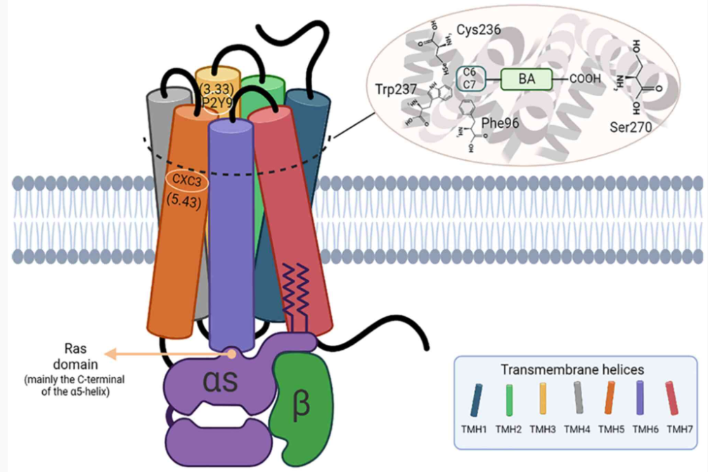 TGR5 受體是第一個已知的膽汁酸特異性G蛋白偶聯受體,也被稱為膽汁酸受體 1(GPBAR1),屬于 A 類 G 蛋白偶聯受體(GPCR)亞家族。該受體由七個跨膜螺旋(TMH1-7)、三個胞外環(ECL1-3)組成,有助于配體結合,以及三個胞內環(ICL1-3),參與將信號傳遞給下游信號分子。