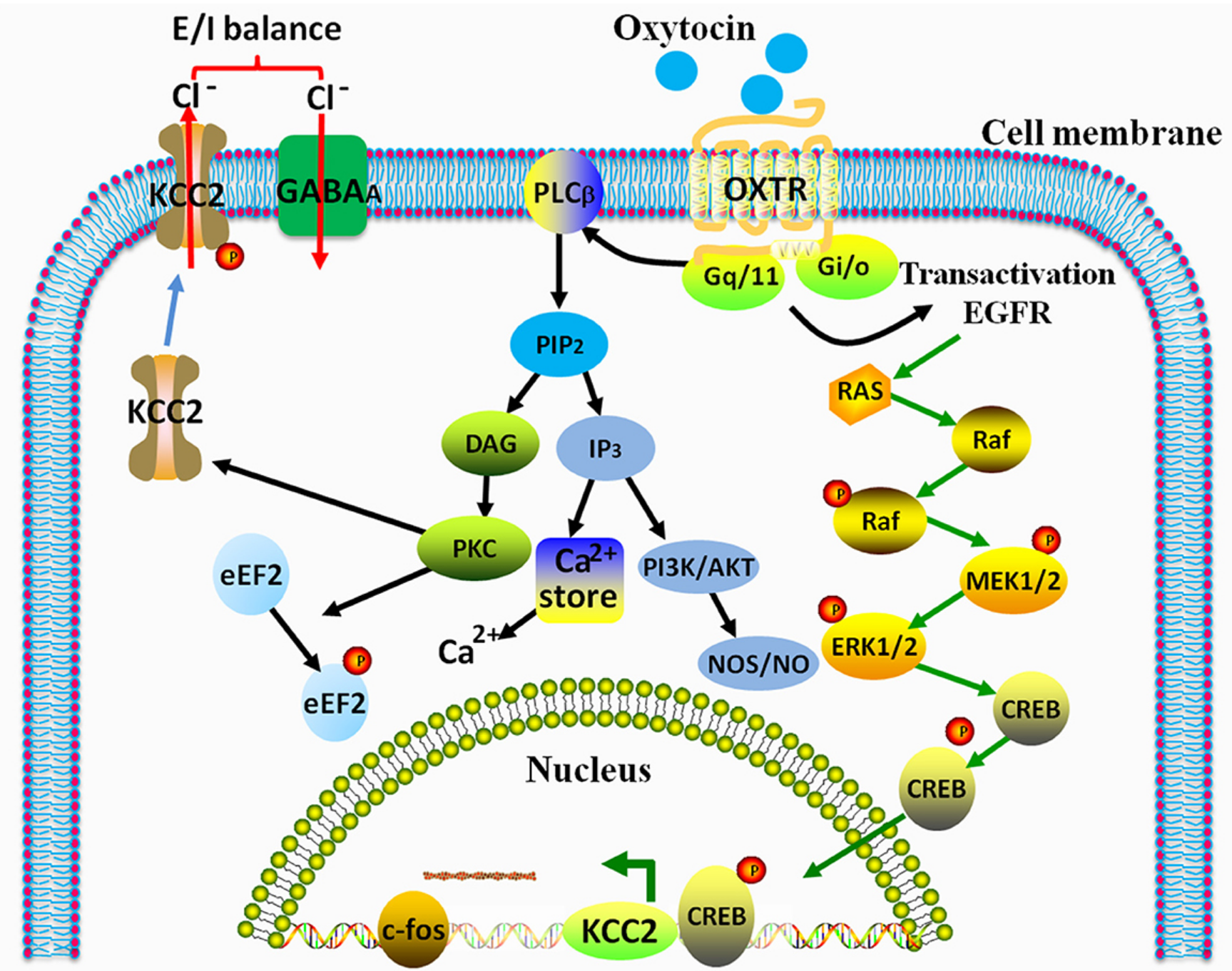 催產(chǎn)素(OXT)是大腦中由下丘腦室旁核(PVN)和視上核(SON)產(chǎn)生的神經(jīng)肽,主要作為外周系統(tǒng)中的激素,可促進(jìn)母乳喂養(yǎng)時(shí)的乳汁分泌,調(diào)節(jié)分娩時(shí)的子宮收縮,緩解疼痛和促進(jìn)分娩過程,促進(jìn)傷口愈合。此外,中樞神經(jīng)系統(tǒng)(CNS)中的 OXT 系統(tǒng)在社會(huì)認(rèn)可、社交行為、焦慮相關(guān)行為和自主神經(jīng)功能中起著重要作用,例如母體行為、攻擊性、交配、依戀和性行為。除了促社會(huì)效應(yīng)外,OXT 還被確定為大腦中重要的抗應(yīng)激和抗焦慮因子,通過其靶受體(催產(chǎn)素受體,OXTR)激活細(xì)胞內(nèi) MEK/ERK 信號(hào)傳導(dǎo)。